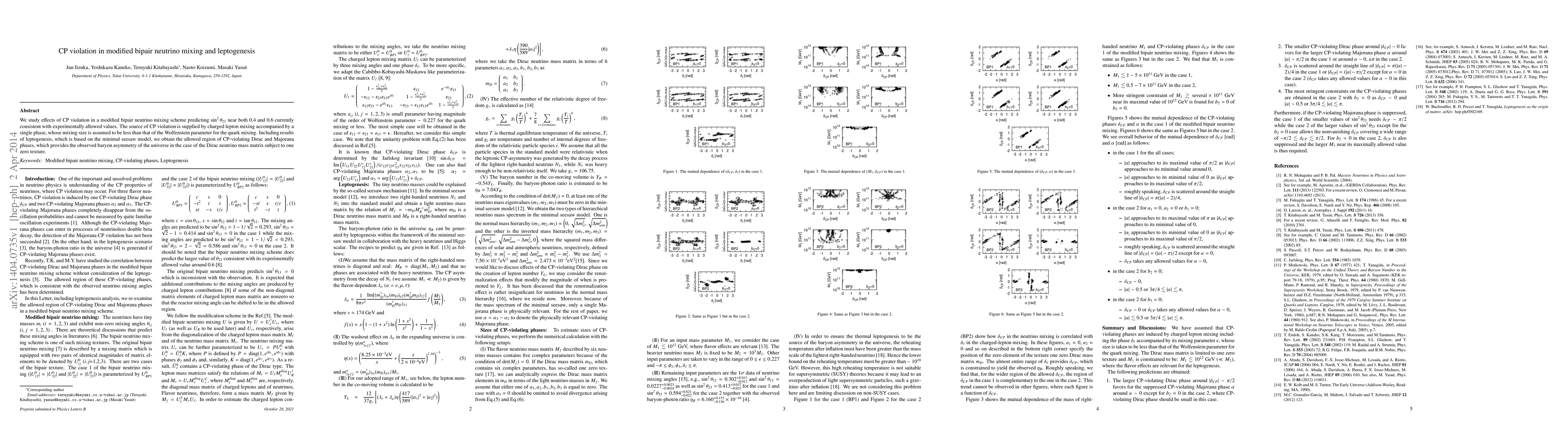 We study effects of CP violation in a modified bipair neutrino mixing scheme predicting $\sin^2\theta_{23}$ near both 0.4 and 0.6 currently consistent with experimentally allowed values. The source of CP violation is supplied by charged lepton mixing accompanied by a single phase, whose mixing size is assumed to be less than that of the Wolfenstein parameter for the quark mixing. Including results of leptogenesis, which is based on the minimal seesaw model, we obtain the allowed region of CP-violating Dirac and Majorana phases, which provides the observed baryon asymmetry of the universe in the case of the Dirac neutrino mass matrix subject to one zero texture.