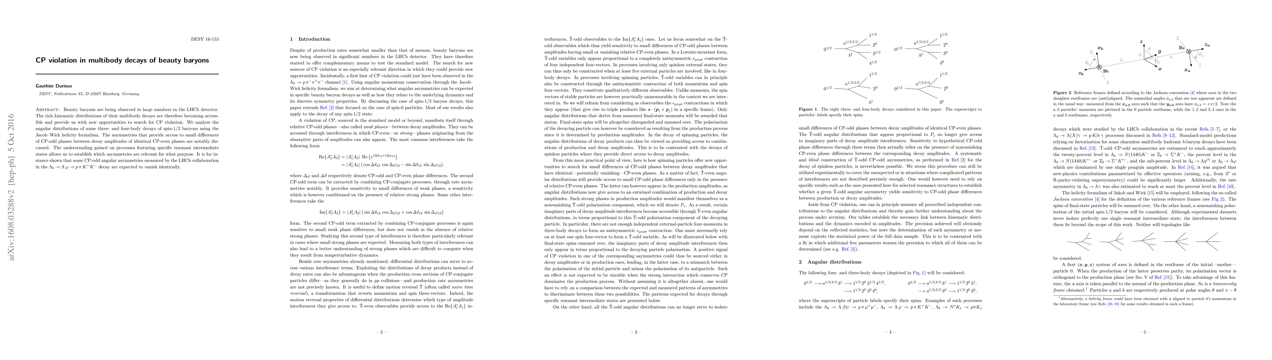 Beauty baryons are being observed in large numbers in the LHCb detector. The rich kinematic distributions of their multibody decays are therefore becoming accessible and provide us with new opportunities to search for CP violation. We analyse the angular distributions of some three- and four-body decays of spin-$1/2$ baryons using the Jacob-Wick helicity formalism. The asymmetries that provide access to small differences of CP-odd phases between decay amplitudes of identical CP-even phases are notably discussed. The understanding gained on processes featuring specific resonant intermediate states allows us to establish which asymmetries are relevant for what purpose. It is for instance shown that some CP-odd angular asymmetries measured by the LHCb collaboration in the $\Lambda_b \to \Lambda\,\varphi \to p\,\pi\, K^+ K^-$ decay are expected to vanish identically.