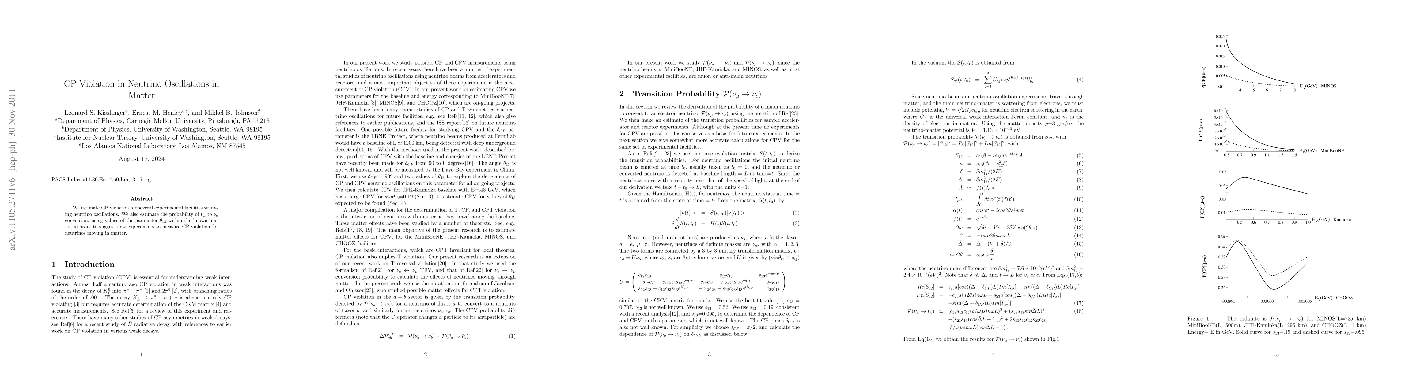 The paper evaluates CP violation in neutrino oscillations across various experimental setups and estimates the probability of $\nu_{\mu}$ converting to $\nu_{e}$ within current $\theta_{13}$ parameter bounds, proposing new experiments to measure CP violation in neutrino oscillations in matter.