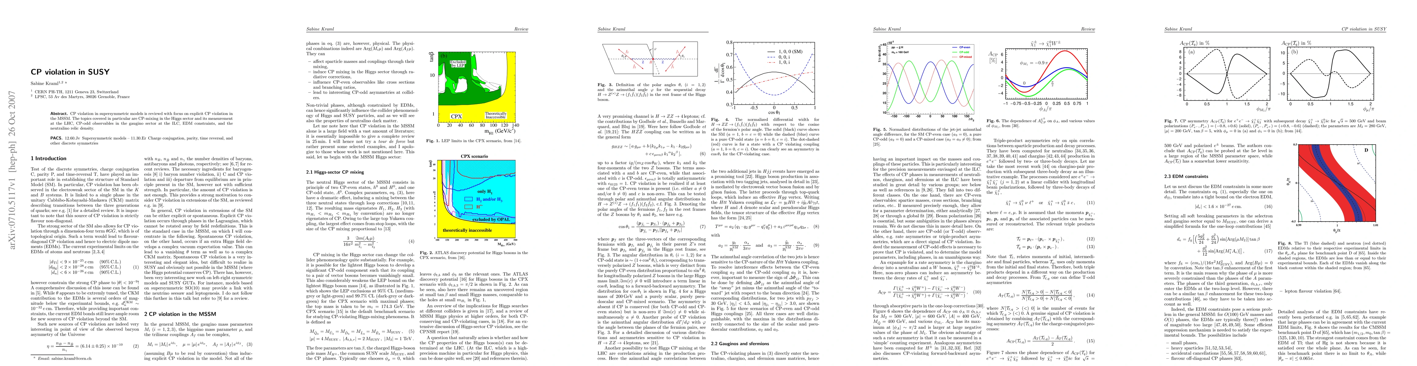 This paper reviews CP violation in supersymmetric models, particularly focusing on the MSSM, with an emphasis on CP-mixing in the Higgs sector, CP-odd observables in the gaugino sector, EDM constraints, and neutralino relic density. The study also discusses implications for measurements at the LHC and ILC.