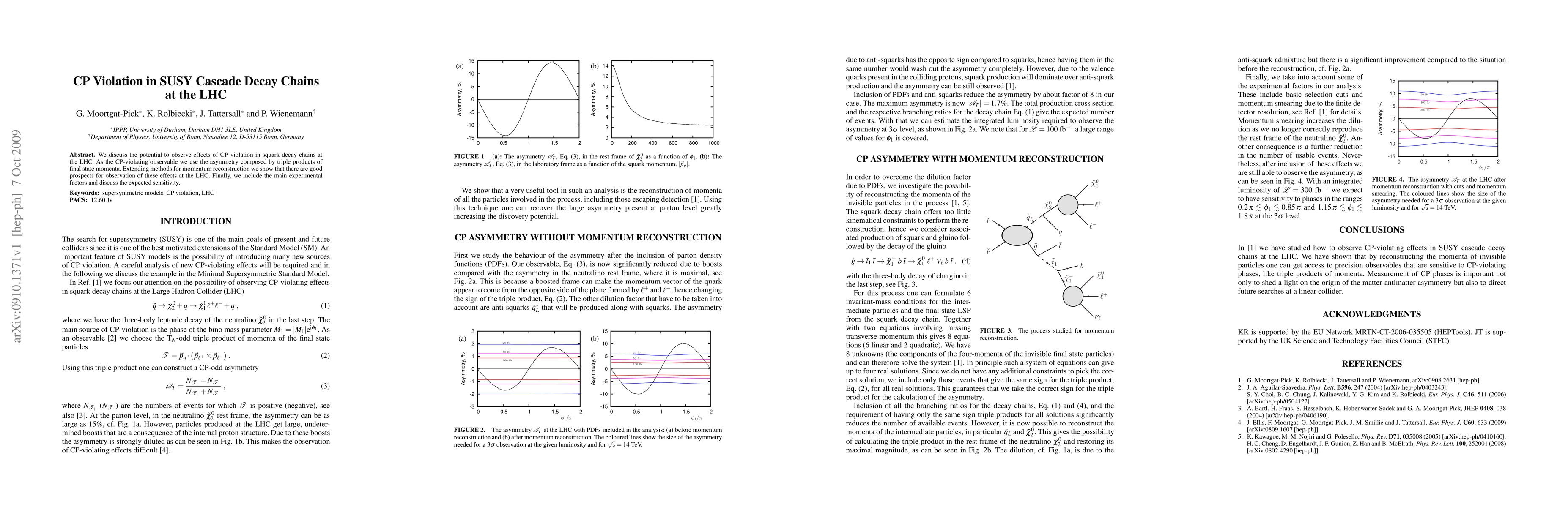 This paper explores the potential for observing CP violation in supersymmetric squark decay chains at the LHC, utilizing an asymmetry based on triple products of final state momenta. It extends momentum reconstruction methods and concludes that there are promising prospects for detecting these effects, considering main experimental factors and expected sensitivity.
