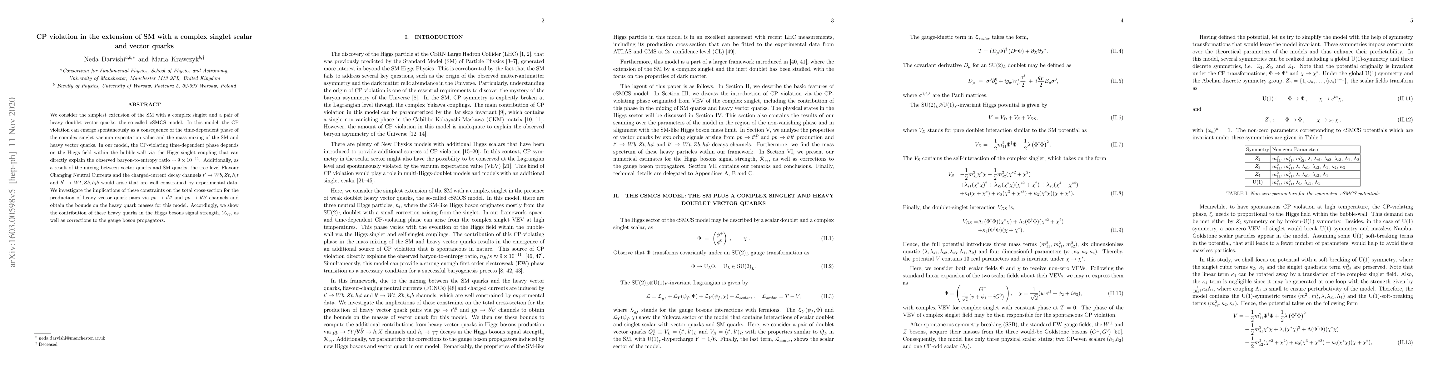 We consider the simplest extension of the SM with a complex singlet and a pair of heavy doublet vector quarks, the so-called cSMCS model. In this model, the CP violation can emerge spontaneously as a consequence of the time-dependent phase of the complex singlet vacuum expectation value and the mass mixing of the SM and heavy vector quarks. In our model, the CP-violating time-dependent phase depends on the Higgs field within the bubble-wall via the Higgs-singlet coupling that can directly explain the observed baryon-to-entropy ratio $\sim 9\times 10^{-11}$. Additionally, as a result of the mixing between vector quarks and SM quarks, the tree level Flavour Changing Neutral Currents and the charged-current decay channels $t' \to Wb, \, Zt, \, h_{i} t$ and $b' \to Wt, \, Zb, \, h_{i} b$ would arise that are well constrained by experimental data. We investigate the implications of these constraints on the total cross-section for the production of heavy vector quark pairs via $pp \to t'\bar{t'}$ and $pp \to b'\bar{b'}$ channels and obtain the bounds on the heavy quark masses for this model. Accordingly, we show the contribution of these heavy quarks in the Higgs bosons signal strength, $\mathcal{R}_{\gamma\gamma}$, as well as corrections to the gauge boson propagators.