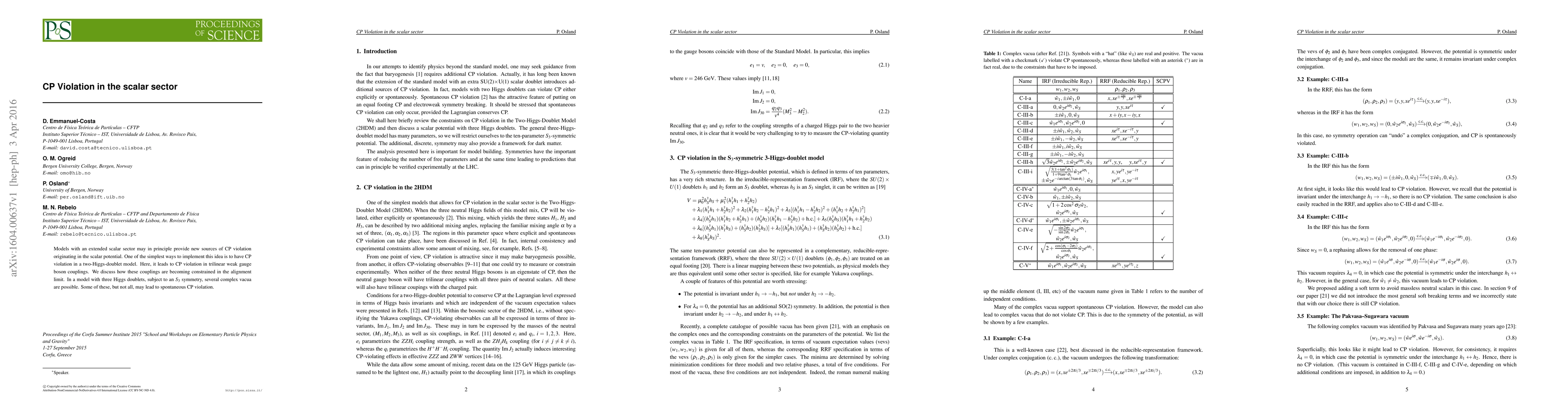 This paper explores CP violation in extended scalar sectors, particularly in two-Higgs-doublet models where it manifests in trilinear weak gauge boson couplings. It discusses constraints on these couplings in the alignment limit and examines spontaneous CP violation in a three-Higgs-doublet model under $S_3$ symmetry.