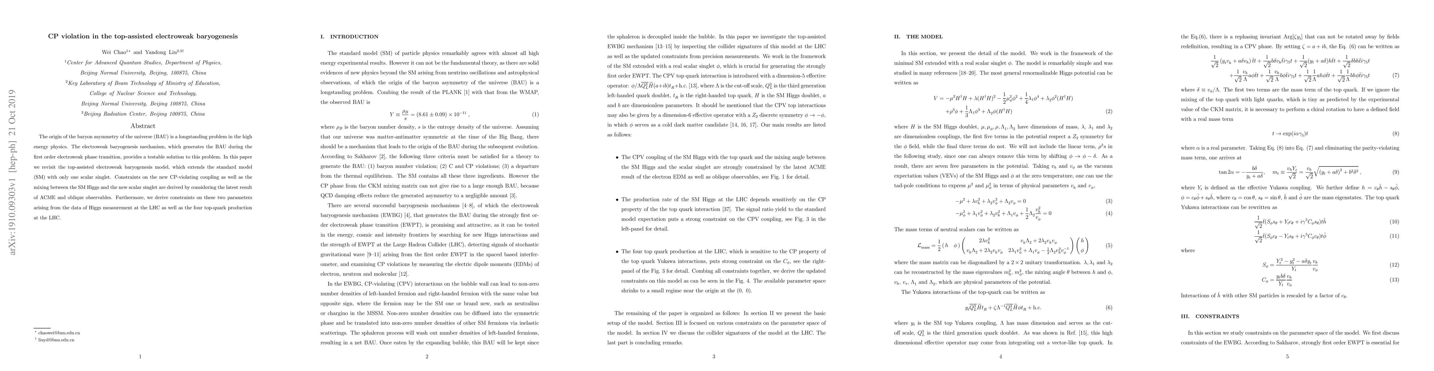 This paper investigates the top-assisted electroweak baryogenesis mechanism, extending the Standard Model with a scalar singlet, to explain the baryon asymmetry of the universe. It derives constraints on the CP-violating coupling and Higgs-singlet mixing, considering recent experimental data from ACME, oblique observables, LHC Higgs measurements, and top-quark production.