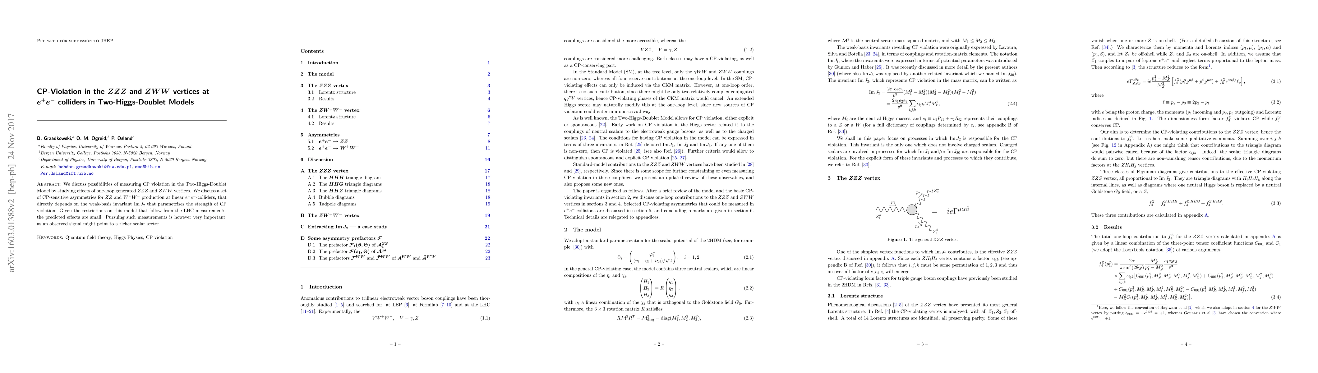 This paper explores the potential for measuring CP-violation in Two-Higgs-Doublet Models through one-loop generated $ZZZ$ and $ZWW$ vertices at $e^+e^-$ colliders. It proposes CP-sensitive asymmetries for $ZZ$ and $W^+W^-$ production that depend on the weak-basis invariant Im $J_2$, despite the predicted small effects due to LHC constraints.
