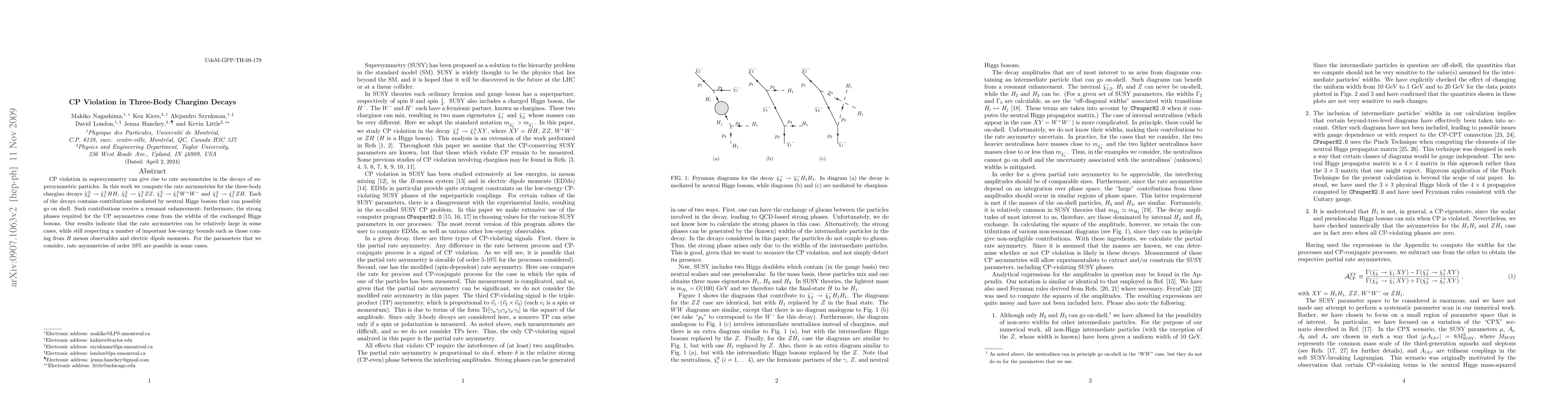 This paper investigates CP violation in three-body chargino decays, finding significant rate asymmetries in decays such as \tilde\chi^\pm_2 \to \tilde\chi^\pm_1 HH, driven by resonant enhancements from on-shell neutral Higgs bosons. Asymmetries of up to 10% are possible while adhering to low-energy constraints.