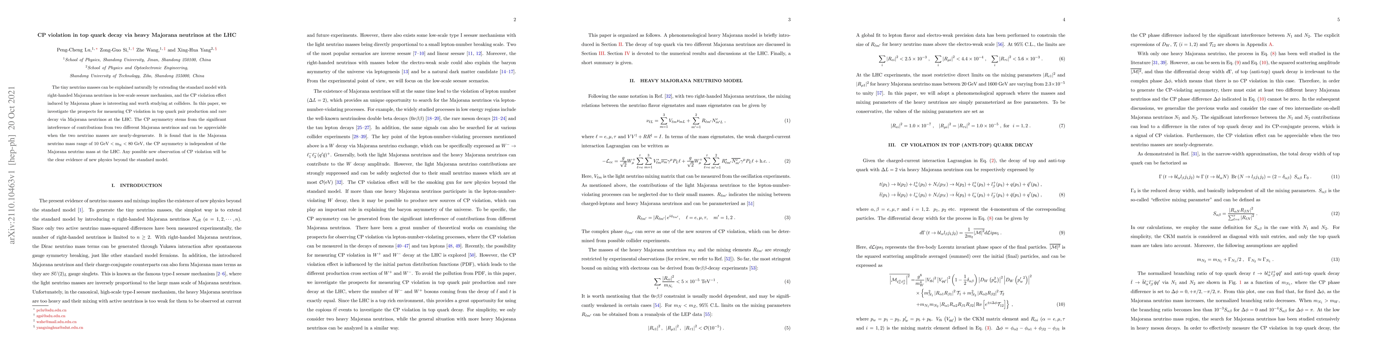 This paper explores the potential for detecting CP violation in top quark decay via heavy Majorana neutrinos at the LHC, suggesting that significant interference from nearly-degenerate Majorana neutrinos could lead to appreciable CP asymmetry in the mass range of 10 GeV to 80 GeV. Any observed CP violation would indicate new physics beyond the standard model.