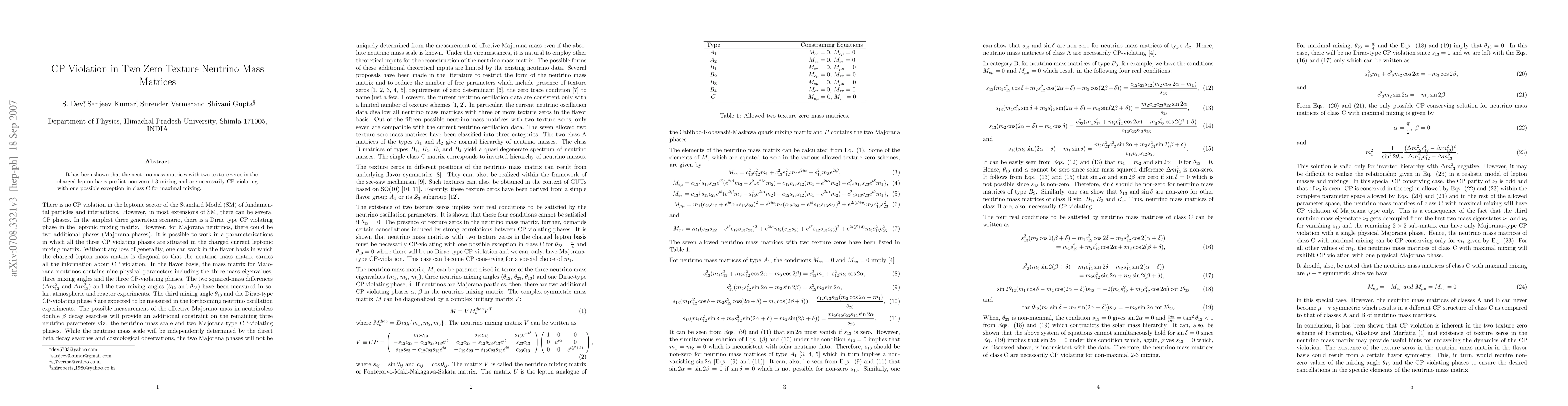 Summary: This paper demonstrates that neutrino mass matrices with two texture zeros predict non-zero 1-3 mixing and CP violation, with a potential exception in class C for maximal mixing. The findings highlight the intricate relationship between texture zeros and CP violation in neutrino physics.