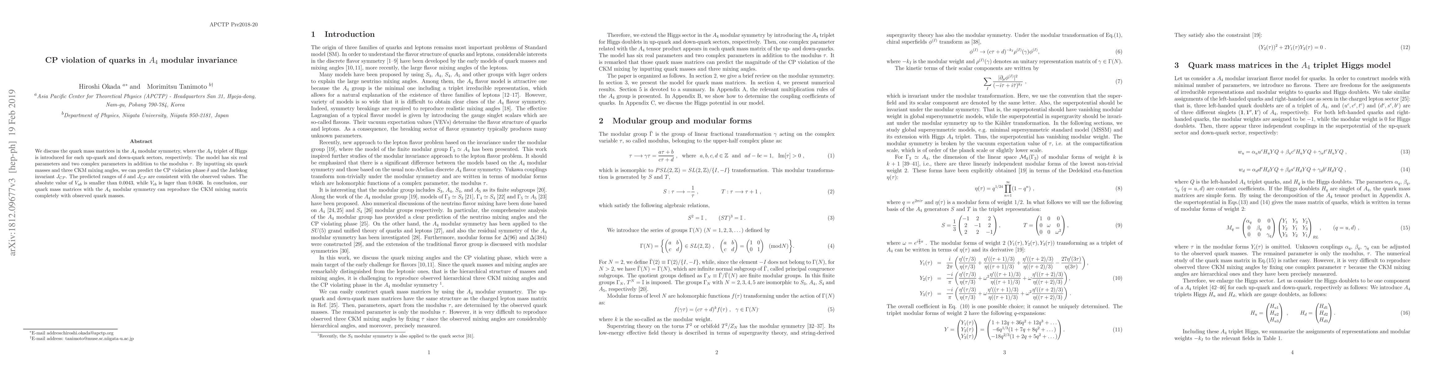 This paper explores quark mass matrices under $A_4$ modular symmetry, introducing an $A_4$ triplet of Higgs for up and down quarks. The model predicts CP violation parameters, $\delta$ and $J_{CP}$, consistent with observed values, while also accurately reproducing the CKM mixing matrix with given quark masses.