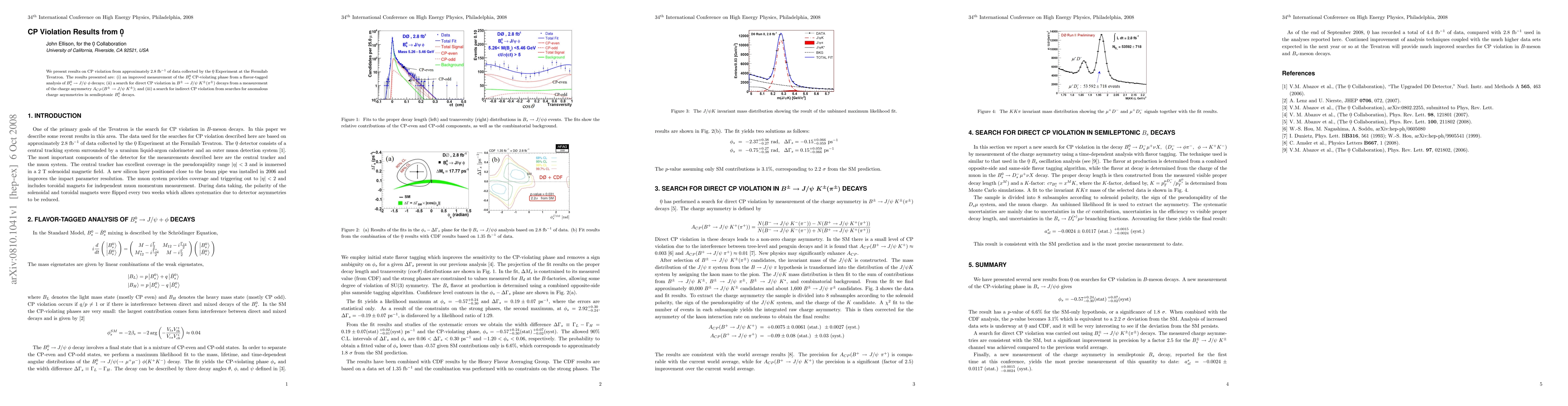 We present results on CP violation from approximately 2.8 fb^{-1} of data collected by the D0 Experiment at the Fermilab Tevatron. The results presented are: (i) an improved measurement of the B_s^0 CP-violating phase from a flavor-tagged analysis of B_s^0 --> J/\psi \phi decays; (ii) a search for direct CP violation in B^{+-} --> J/\psi K^{+-} (\pi^{+-}) decays from a measurement of the charge asymmetry A_{CP}(B^{+-} --> J/\psi K^{+-}); and (iii) a search for indirect CP violation from searches for anomalous charge asymmetries in semileptonic B_s^0 decays.