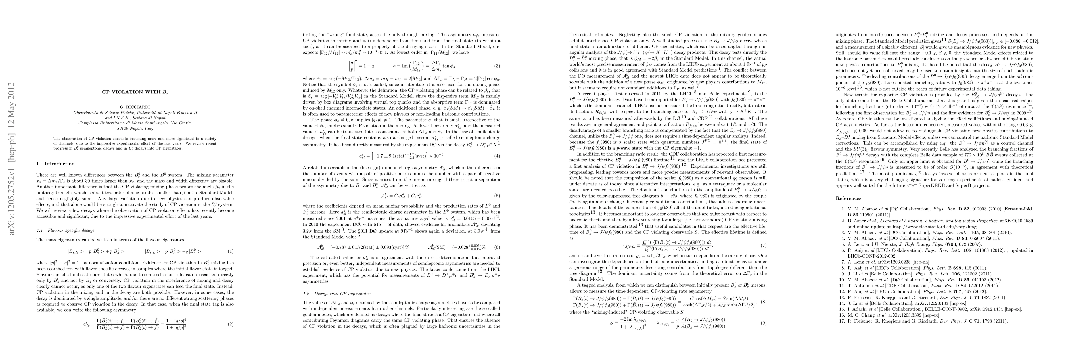 **Summary:** This paper reviews recent advancements in the study of CP violation in Bs meson decays, focusing on semileptonic decays and decays into CP eigenstates, highlighting the significance of these observations due to recent experimental progress.