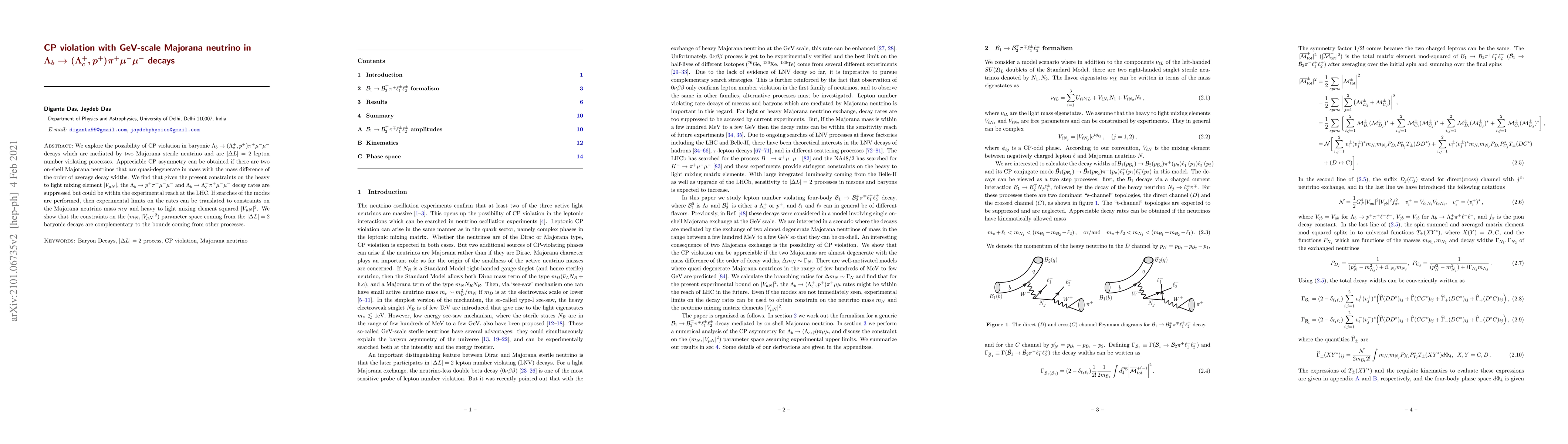 We explore the possibility of CP violation in baryonic $\Lambda_b\to(\Lambda_c^+, p^+)\pi^+\mu^-\mu^-$ decays which are mediated by two Majorana sterile neutrino and are $|\Delta L|=2$ lepton number violating processes. Appreciable CP asymmetry can be obtained if there are two on-shell Majorana neutrinos that are quasi-degenerate in mass with the mass difference of the order of average decay widths. We find that given the present constraints on the heavy to light mixing element $|V_{\mu N}|$, the $\Lambda_b\to p^+\pi^+\mu^-\mu^-$ and $\Lambda_b\to \Lambda_c^+\pi^+\mu^-\mu^-$ decay rates are suppressed but could be within the experimental reach at the LHC. If searches of the modes are performed, then experimental limits on the rates can be translated to constraints on the Majorana neutrino mass $m_N$ and heavy to light mixing element squared $|V_{\mu N}|^2$. We show that the constraints on the $(m_N, |V_{\mu N}|^2)$ parameter space coming from the $|\Delta L| = 2$ baryonic decays are complementary to the bounds coming from other processes.