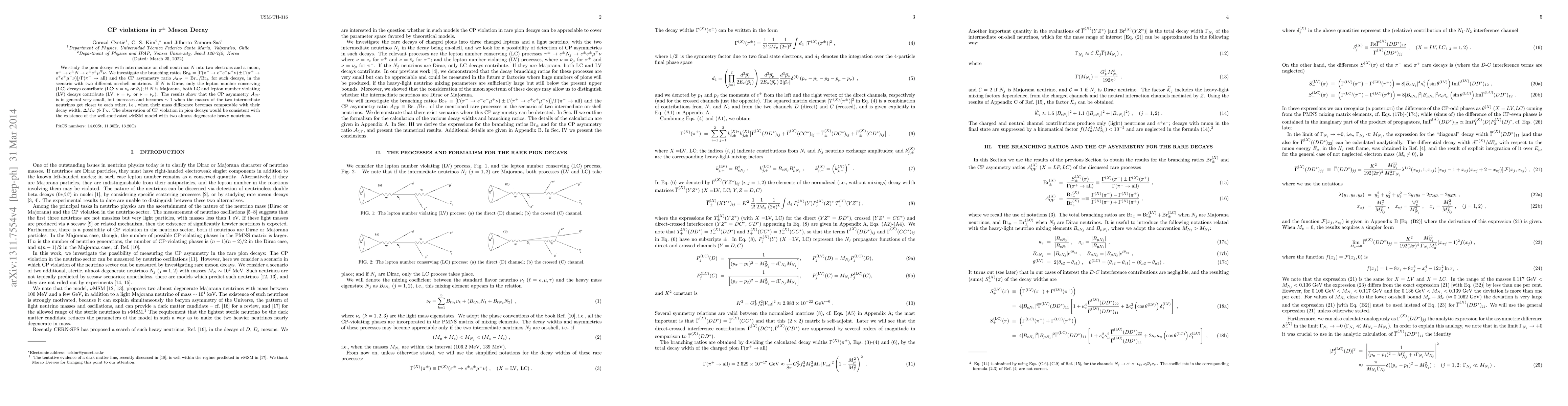We study the pion decays with intermediate on-shell neutrinos $N$ into two electrons and a muon, $\pi^{\pm} \to e^{\pm} N \to e^{\pm} e^{\pm} \mu^{\mp} \nu$. We investigate the branching ratios ${\rm Br}_{\pm} = [\Gamma(\pi^- \to e^- e^- \mu^+ \nu) \pm \Gamma(\pi^+ \to e^+e^+\mu^-\nu)]/\Gamma(\pi^- \to {\rm all})$ and the CP asymmetry ratio ${\cal A}_{\rm CP} = {\rm Br}_{-}/{\rm Br}_{+}$ for such decays, in the scenario with two different on-shell neutrinos. If $N$ is Dirac, only the lepton number conserving (LC) decays contribute (LC: $\nu= {\nu}_e$ or ${\bar \nu}_e$); if $N$ is Majorana, both LC and lepton number violating (LV) decays contribute (LV: $\nu={\bar \nu}_{\mu}$ or $\nu={\nu}_{\mu}$). The results show that the CP asymmetry ${\cal A}_{\rm CP}$ is in general very small, but increases and becomes $\sim 1$ when the masses of the two intermediate neutrinos get closer to each other, i.e., when their mass difference becomes comparable with their decay width, $\Delta M_N \not\gg \Gamma_N$. The observation of CP violation in pion decays would be consistent with the existence of the well-motivated $\nu$MSM model with two almost degenerate heavy neutrinos.