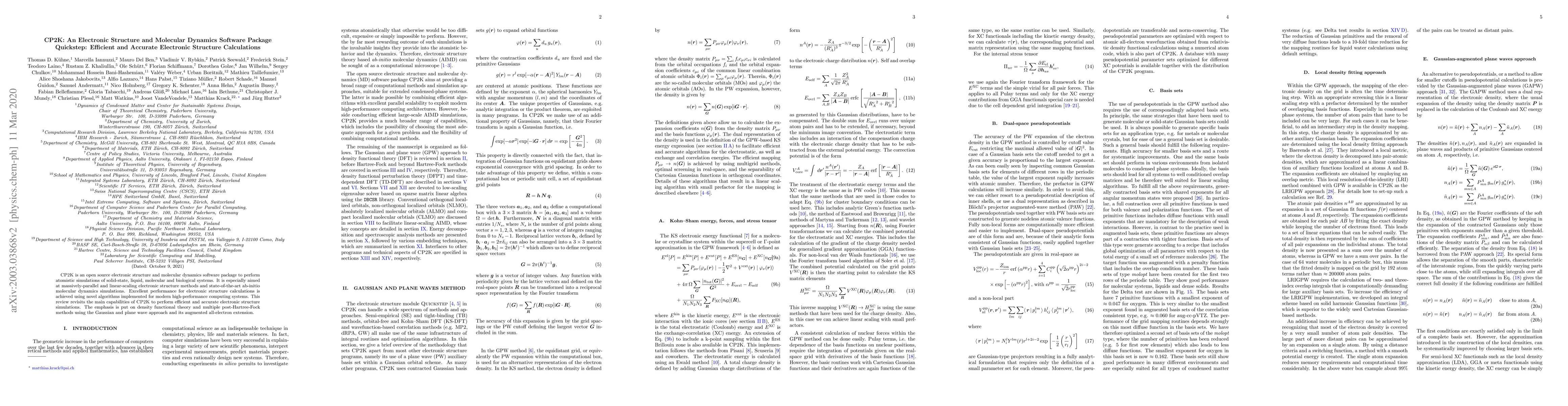 CP2K is an open-source software package for electronic structure and molecular dynamics simulations, excelling in parallel computing and linear-scaling methods. It focuses on efficient and accurate calculations using advanced algorithms, particularly for density functional theory and post-Hartree-Fock methods.