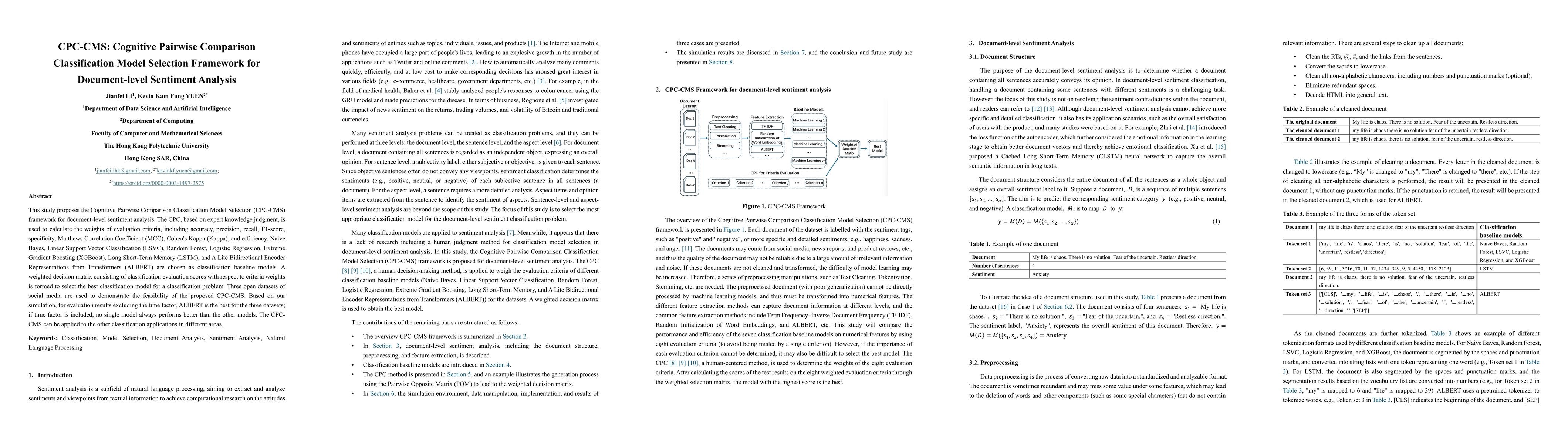 This study proposes the Cognitive Pairwise Comparison Classification Model Selection (CPC-CMS) framework for document-level sentiment analysis. The CPC, based on expert knowledge judgment, is used to calculate the weights of evaluation criteria, including accuracy, precision, recall, F1-score, specificity, Matthews Correlation Coefficient (MCC), Cohen's Kappa (Kappa), and efficiency. Naive Bayes, Linear Support Vector Classification (LSVC), Random Forest, Logistic Regression, Extreme Gradient Boosting (XGBoost), Long Short-Term Memory (LSTM), and A Lite Bidirectional Encoder Representations from Transformers (ALBERT) are chosen as classification baseline models. A weighted decision matrix consisting of classification evaluation scores with respect to criteria weights, is formed to select the best classification model for a classification problem. Three open datasets of social media are used to demonstrate the feasibility of the proposed CPC-CMS. Based on our simulation, for evaluation results excluding the time factor, ALBERT is the best for the three datasets; if time consumption is included, no single model always performs better than the other models. The CPC-CMS can be applied to the other classification applications in different areas.