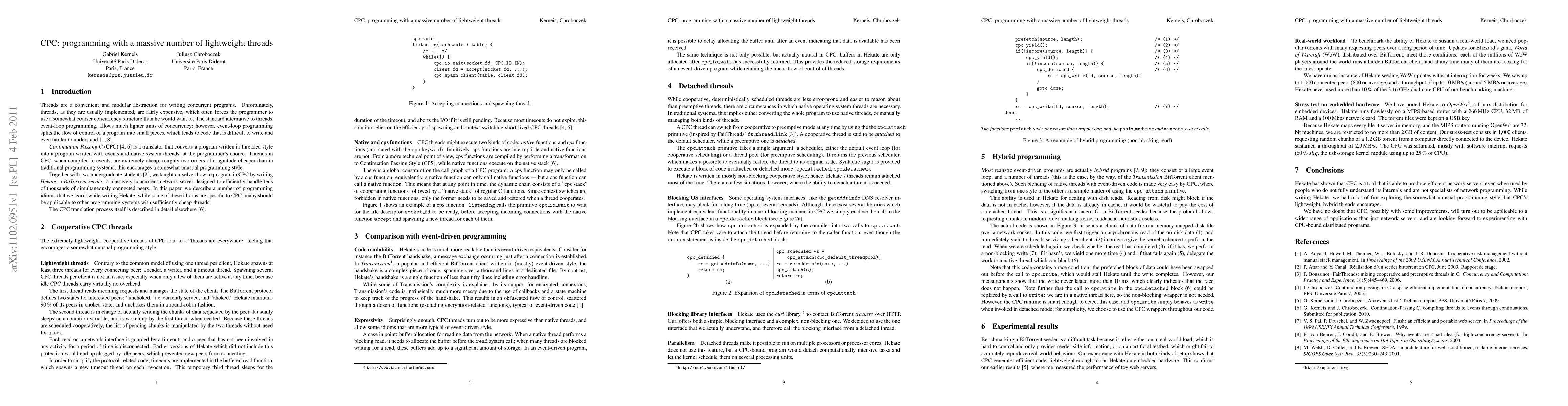 This paper introduces Continuation Passing C (CPC), a translator that converts threaded concurrent programs into event-based ones using lightweight threads, aiming to simplify concurrency. The authors developed CPC to create Hekate, a highly concurrent network server, and share programming idioms learned from this experience, applicable to other systems with inexpensive threads.