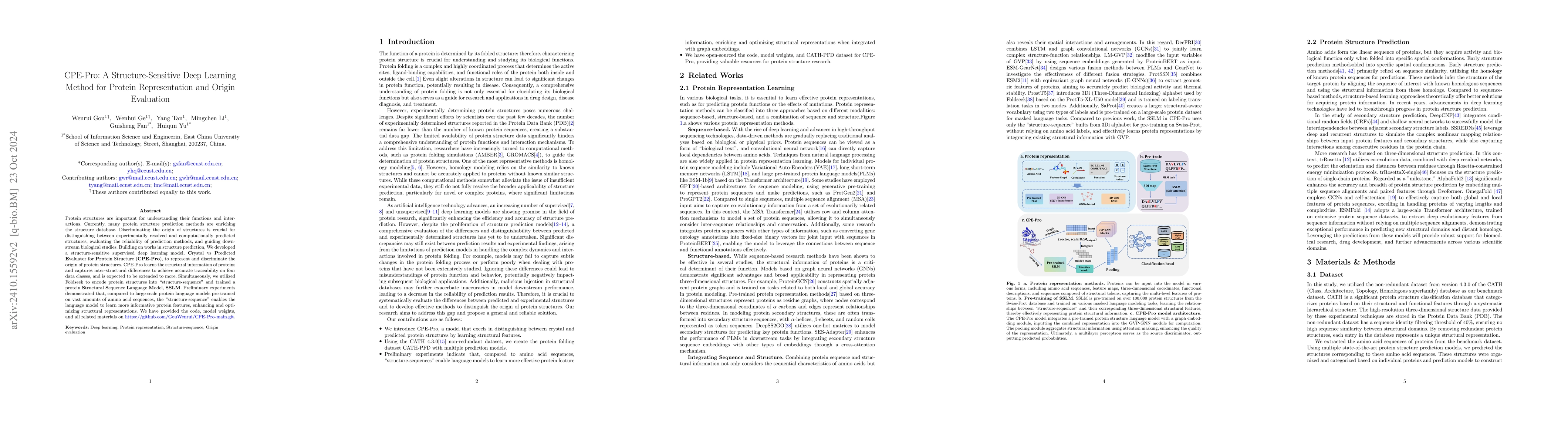 Protein structures are important for understanding their functions and interactions. Currently, many protein structure prediction methods are enriching the structure database. Discriminating the origin of structures is crucial for distinguishing between experimentally resolved and computationally predicted structures, evaluating the reliability of prediction methods, and guiding downstream biological studies. Building on works in structure prediction, We developed a structure-sensitive supervised deep learning model, Crystal vs Predicted Evaluator for Protein Structure (CPE-Pro), to represent and discriminate the origin of protein structures. CPE-Pro learns the structural information of proteins and captures inter-structural differences to achieve accurate traceability on four data classes, and is expected to be extended to more. Simultaneously, we utilized Foldseek to encode protein structures into "structure-sequence" and trained a protein Structural Sequence Language Model, SSLM. Preliminary experiments demonstrated that, compared to large-scale protein language models pre-trained on vast amounts of amino acid sequences, the "structure-sequences" enable the language model to learn more informative protein features, enhancing and optimizing structural representations. We have provided the code, model weights, and all related materials on https://github.com/GouWenrui/CPE-Pro-main.git.