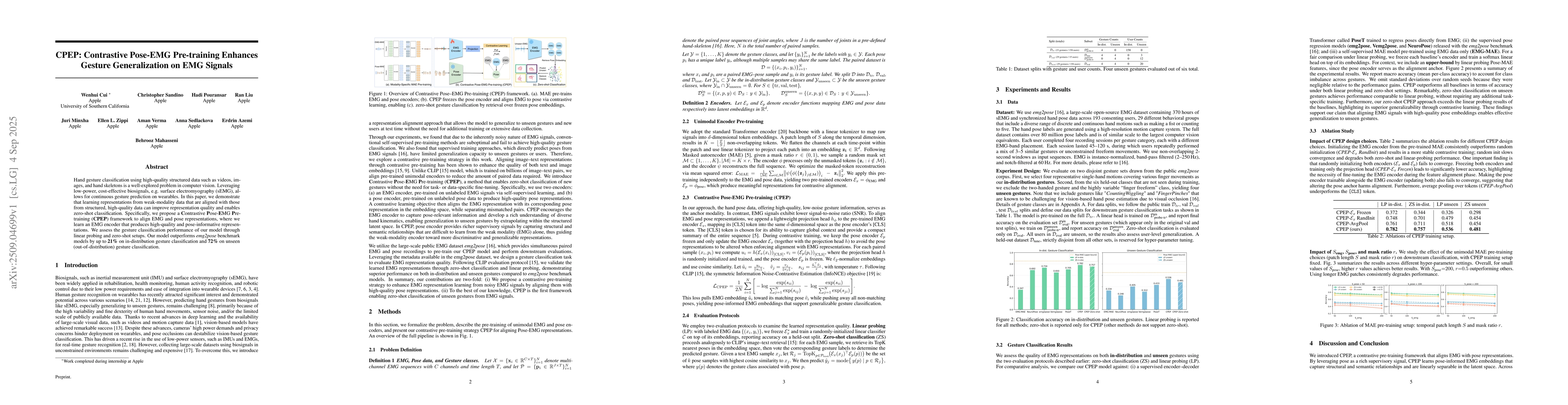Hand gesture classification using high-quality structured data such as videos, images, and hand skeletons is a well-explored problem in computer vision. Leveraging low-power, cost-effective biosignals, e.g. surface electromyography (sEMG), allows for continuous gesture prediction on wearables. In this paper, we demonstrate that learning representations from weak-modality data that are aligned with those from structured, high-quality data can improve representation quality and enables zero-shot classification. Specifically, we propose a Contrastive Pose-EMG Pre-training (CPEP) framework to align EMG and pose representations, where we learn an EMG encoder that produces high-quality and pose-informative representations. We assess the gesture classification performance of our model through linear probing and zero-shot setups. Our model outperforms emg2pose benchmark models by up to 21% on in-distribution gesture classification and 72% on unseen (out-of-distribution) gesture classification.