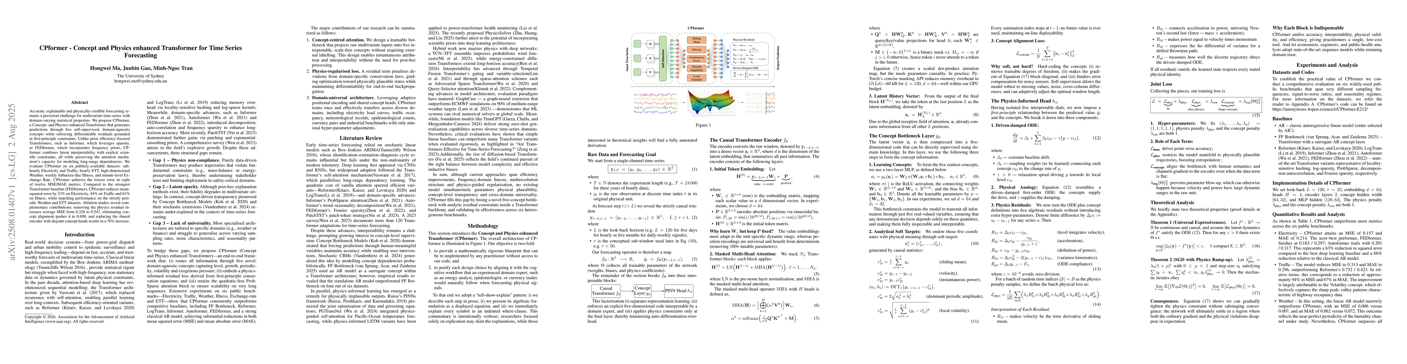 Accurate, explainable and physically-credible forecasting remains a persistent challenge for multivariate time-series whose statistical properties vary across domains. We present CPformer, a Concept- and Physics-enhanced Transformer that channels every prediction through five self-supervised, domain-agnostic concepts while enforcing differentiable residuals drawn from first-principle constraints. Unlike prior efficiency-oriented Transformers that rely purely on sparsity or frequency priors , CPformer combines latent transparency with hard scientific guidance while retaining attention for long contexts. We tested CPformer on six publicly-available datasets: sub-hourly Electricity and Traffic, hourly ETT, high-dimensional Weather, weekly Influenza-like Illness, and minute-level Exchange Rate, and CPformer achieves the lowest error in eight of twelve MSE/MAE cells. Relative to the strongest Transformer baseline (FEDformer), CPformer reduces mean-squared-error by 23% on Electricity, 44% on Traffic and 61% on Illness, while matching performance on strictly periodic Weather and ETT series.