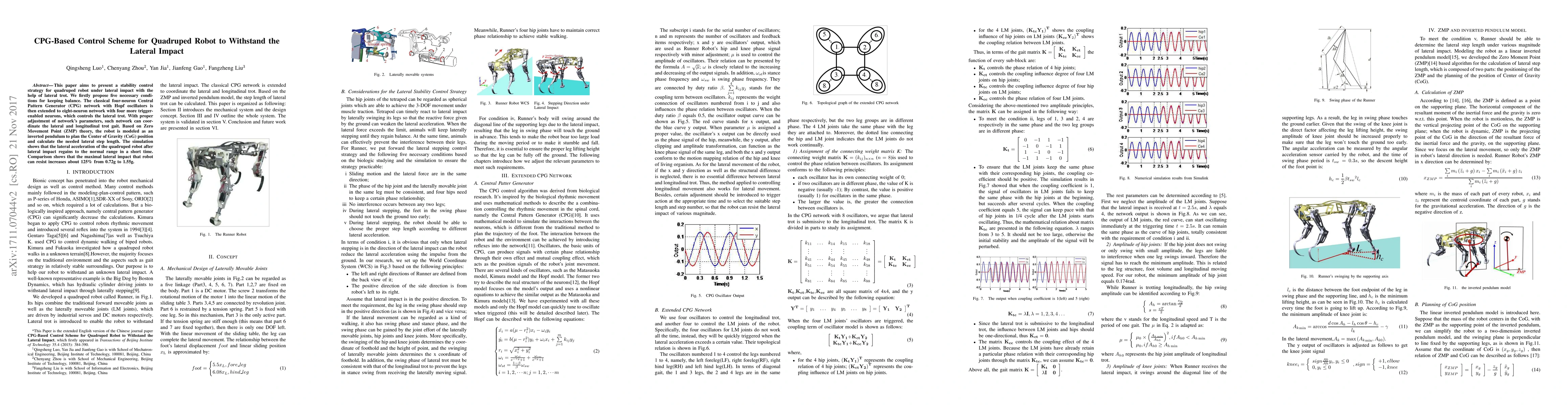 This paper proposes a stability control strategy for a quadruped robot using a modified CPG network to manage lateral trot and balance after impact, enhancing resistance to lateral forces by 125%. Simulation results demonstrate effective recovery of stability following lateral impact.