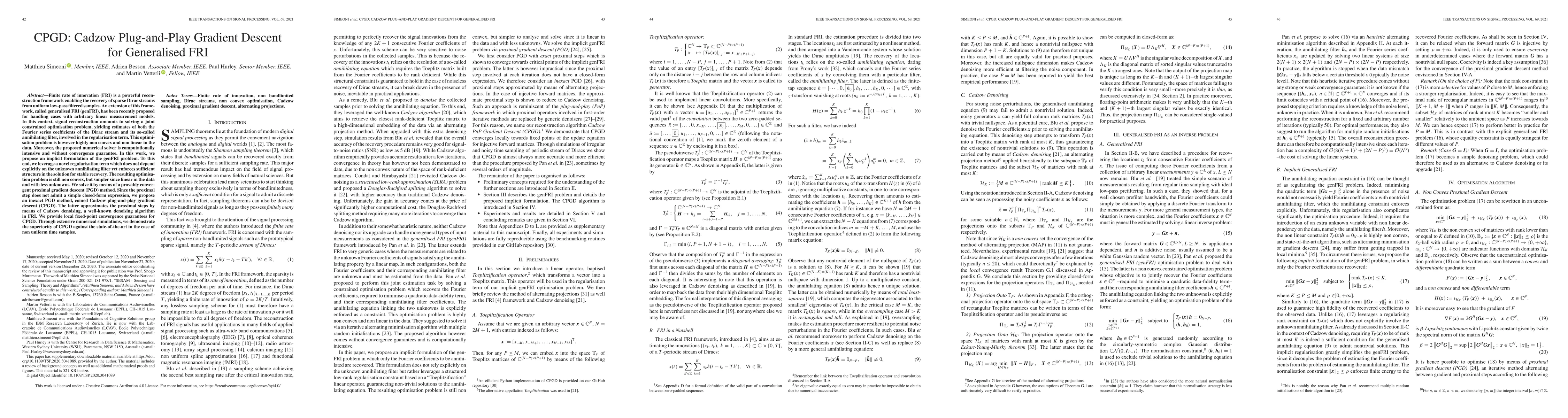 This paper proposes a Cadzow plug-and-play gradient descent (CPGD) method to solve the generalised FRI problem, which simplifies the non-convex optimisation problem by introducing a novel regularisation term. CPGD approximates the proximal steps using Cadzow denoising, providing a provably convergent solution and demonstrating superior performance in reconstruction accuracy compared to state-of-the-art methods.