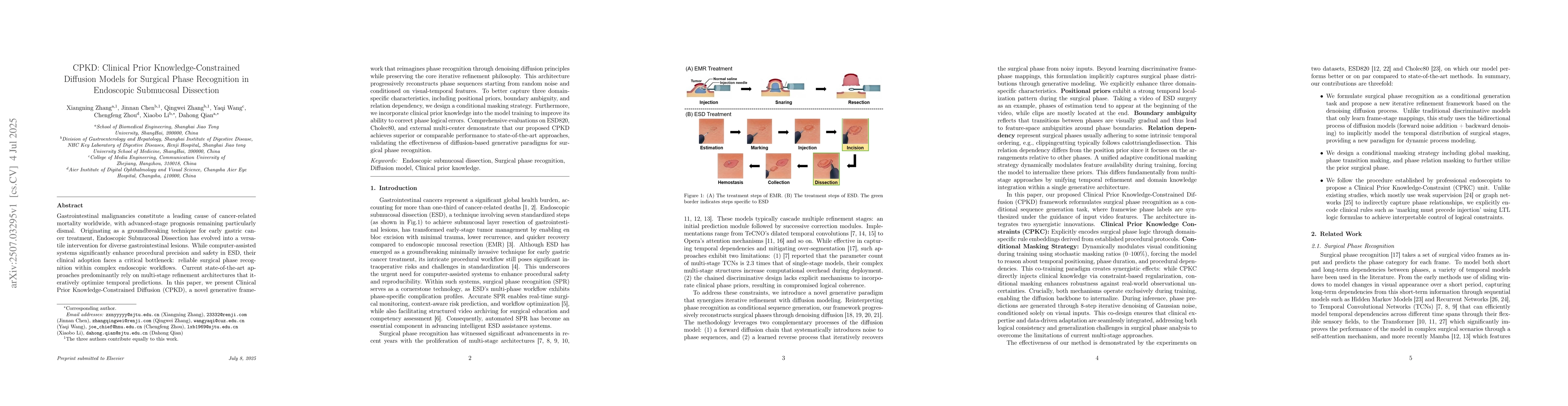 Gastrointestinal malignancies constitute a leading cause of cancer-related mortality worldwide, with advanced-stage prognosis remaining particularly dismal. Originating as a groundbreaking technique for early gastric cancer treatment, Endoscopic Submucosal Dissection has evolved into a versatile intervention for diverse gastrointestinal lesions. While computer-assisted systems significantly enhance procedural precision and safety in ESD, their clinical adoption faces a critical bottleneck: reliable surgical phase recognition within complex endoscopic workflows. Current state-of-the-art approaches predominantly rely on multi-stage refinement architectures that iteratively optimize temporal predictions. In this paper, we present Clinical Prior Knowledge-Constrained Diffusion (CPKD), a novel generative framework that reimagines phase recognition through denoising diffusion principles while preserving the core iterative refinement philosophy. This architecture progressively reconstructs phase sequences starting from random noise and conditioned on visual-temporal features. To better capture three domain-specific characteristics, including positional priors, boundary ambiguity, and relation dependency, we design a conditional masking strategy. Furthermore, we incorporate clinical prior knowledge into the model training to improve its ability to correct phase logical errors. Comprehensive evaluations on ESD820, Cholec80, and external multi-center demonstrate that our proposed CPKD achieves superior or comparable performance to state-of-the-art approaches, validating the effectiveness of diffusion-based generative paradigms for surgical phase recognition.