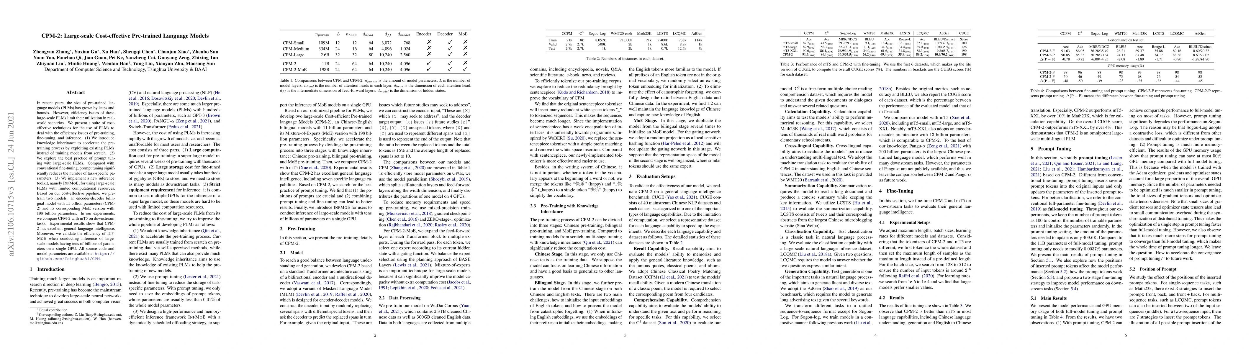 This paper introduces cost-effective techniques to enhance the efficiency of large-scale pre-trained language models (PLMs), including knowledge inheritance for accelerated pre-training, prompt tuning to reduce task-specific parameters, and InfMoE for inference on limited resources. The authors present CPM-2 models, showing superior language intelligence and efficient inference, with all code and models available for public use.