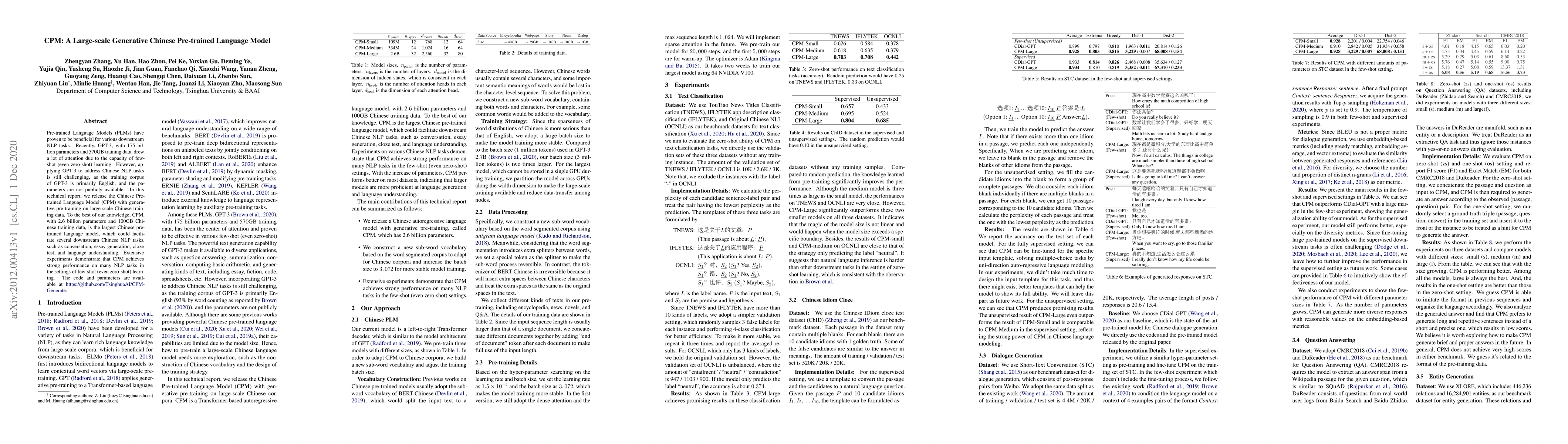 The CPM is a large-scale Chinese pre-trained language model with 2.6 billion parameters, trained on 100GB of Chinese data, designed to facilitate various Chinese NLP tasks. It achieves strong performance in few-shot and zero-shot learning, and its code and parameters are publicly available.