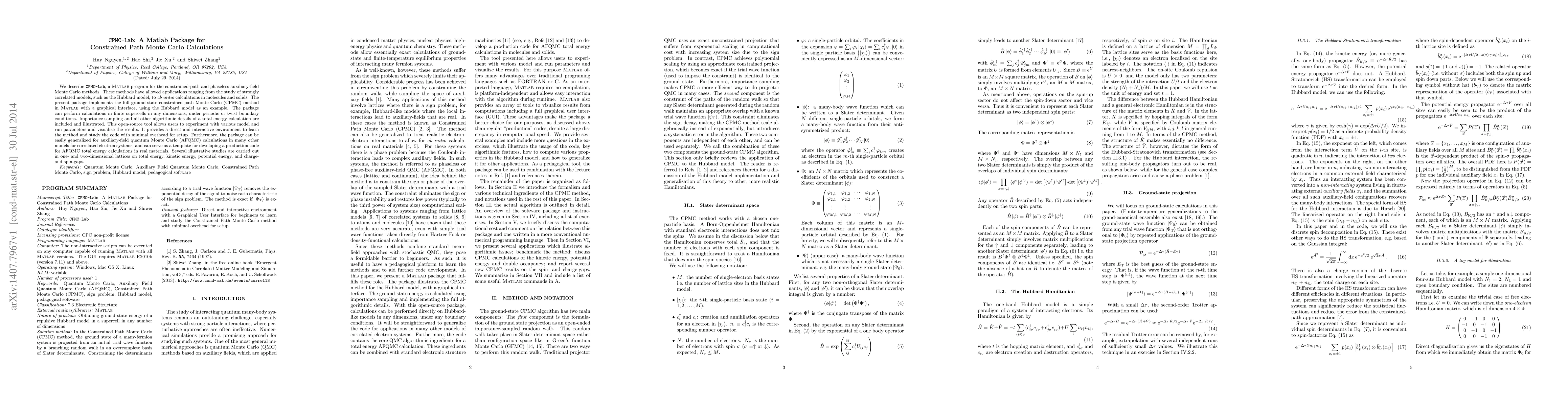 CPMC-Lab is a Matlab package for implementing constrained-path Monte Carlo methods, facilitating the study of strongly correlated models and enabling ab initio calculations. It offers a graphical interface for total energy calculations in finite supercells, with applications demonstrated on the Hubbard model.