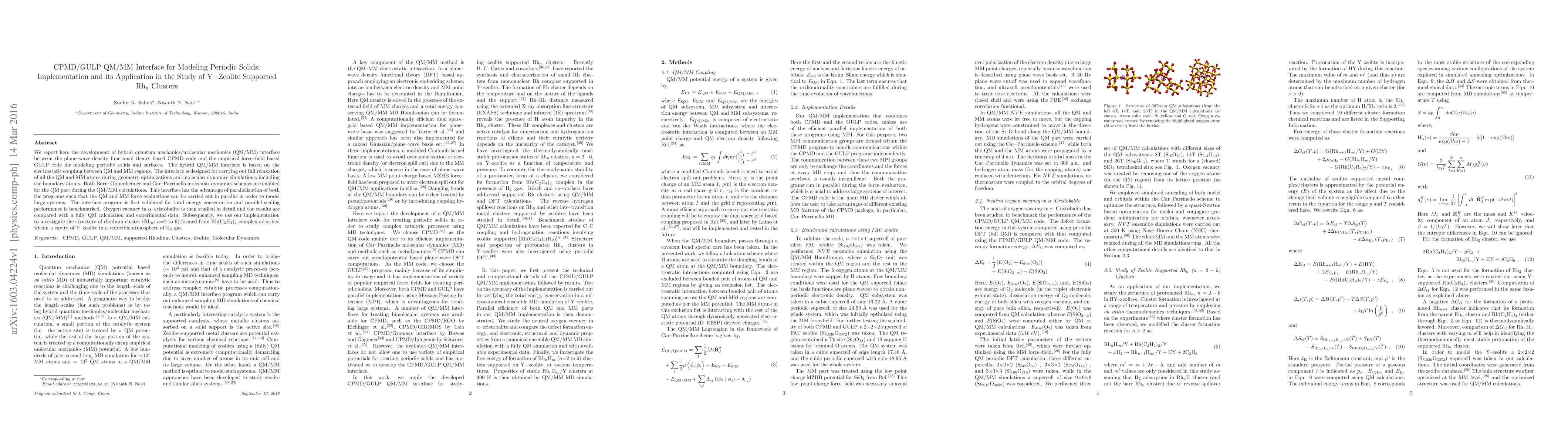 This paper develops a hybrid QM/MM interface between CPMD and GULP for modeling periodic solids, enabling full relaxation during optimizations and molecular dynamics. The interface is validated and applied to study Y-zeolite supported Rh$_n$ clusters, showing good agreement with fully QM calculations and experimental data.