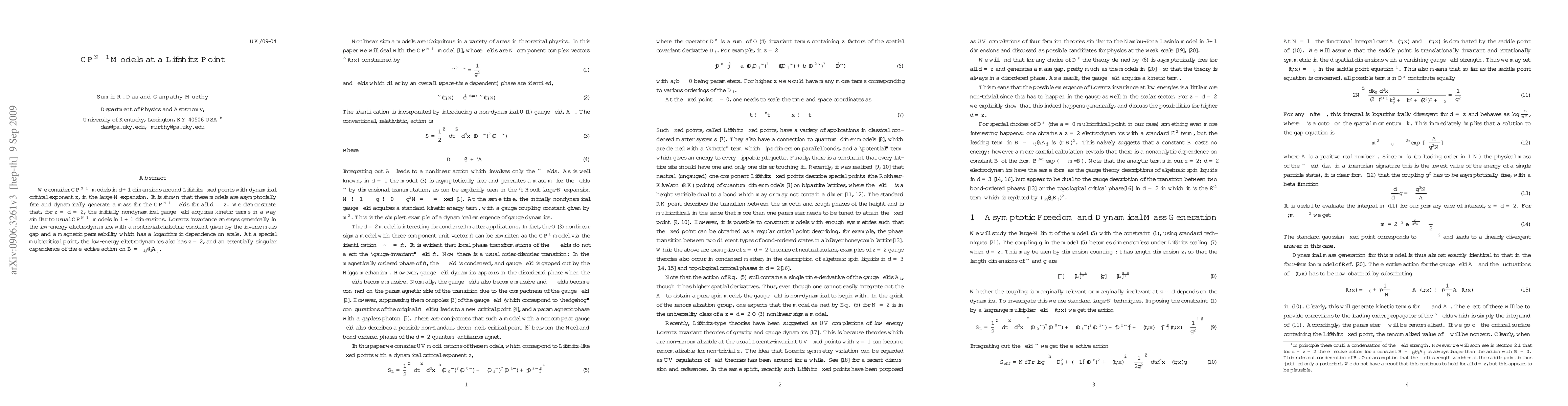 This paper investigates $CP^{N-1}$ models in $d+1$ dimensions near Lifshitz points, demonstrating that they are asymptotically free and generate a mass for fields when $d=z$. For $z=d=2$, the gauge field acquires kinetic terms akin to 1+1 dimensional models, leading to Lorentz invariant electrodynamics with a nontrivial dielectric constant and a logarithmic magnetic permeability.