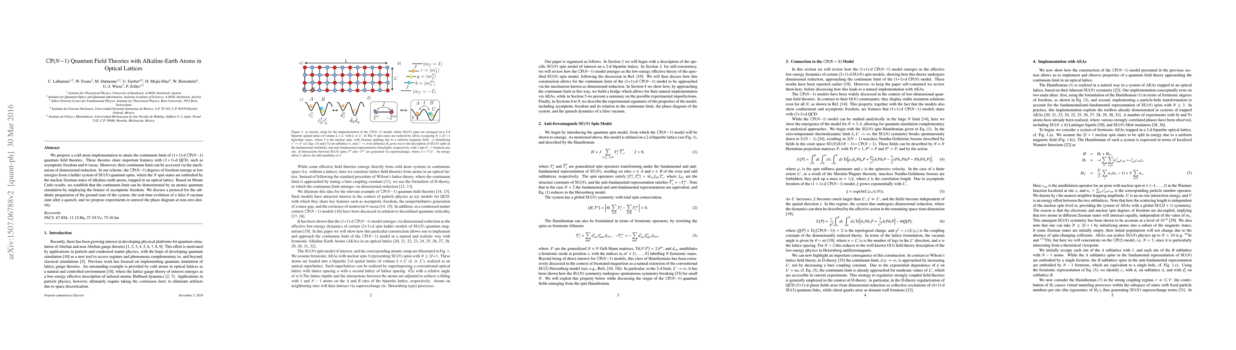 We propose a cold atom implementation to attain the continuum limit of (1+1)-d CP(N-1) quantum field theories. These theories share important features with (3+1)-d QCD, such as asymptotic freedom and $\theta$ vacua. Moreover, their continuum limit can be accessed via the mechanism of dimensional reduction. In our scheme, the CP(N-1) degrees of freedom emerge at low energies from a ladder system of SU(N) quantum spins, where the N spin states are embodied by the nuclear Zeeman states of alkaline-earth atoms, trapped in an optical lattice. Based on Monte Carlo results, we establish that the continuum limit can be demonstrated by an atomic quantum simulation by employing the feature of asymptotic freedom. We discuss a protocol for the adiabatic state preparation of the ground state of the system, the real-time evolution of a false $\theta$-vacuum state after a quench, and we propose experiments to unravel the phase diagram at non-zero density.