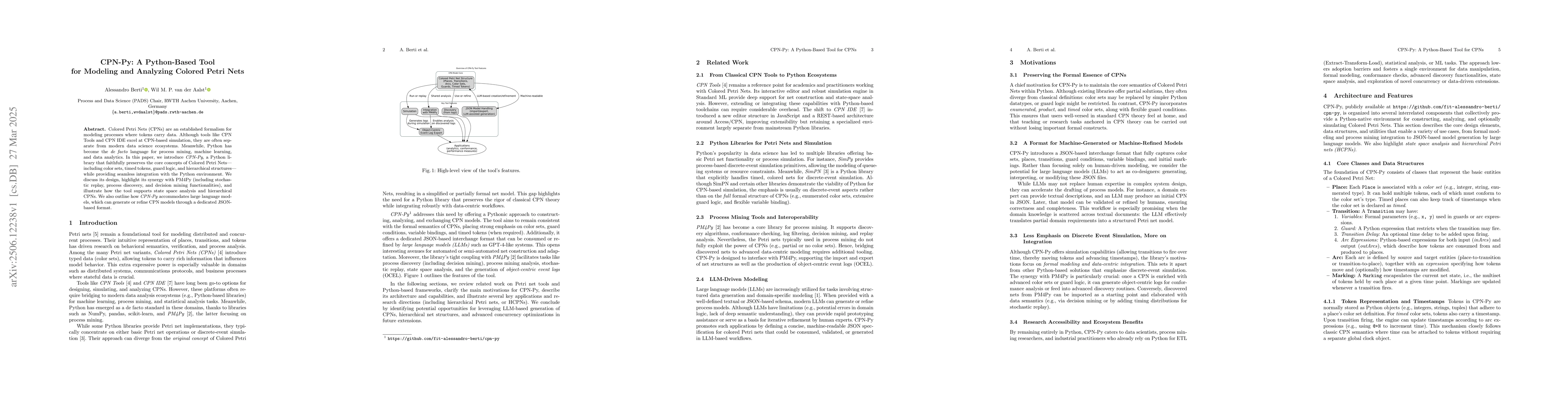 Colored Petri Nets (CPNs) are an established formalism for modeling processes where tokens carry data. Although tools like CPN Tools and CPN IDE excel at CPN-based simulation, they are often separate from modern data science ecosystems. Meanwhile, Python has become the de facto language for process mining, machine learning, and data analytics. In this paper, we introduce CPN-Py, a Python library that faithfully preserves the core concepts of Colored Petri Nets -- including color sets, timed tokens, guard logic, and hierarchical structures -- while providing seamless integration with the Python environment. We discuss its design, highlight its synergy with PM4Py (including stochastic replay, process discovery, and decision mining functionalities), and illustrate how the tool supports state space analysis and hierarchical CPNs. We also outline how CPN-Py accommodates large language models, which can generate or refine CPN models through a dedicated JSON-based format.