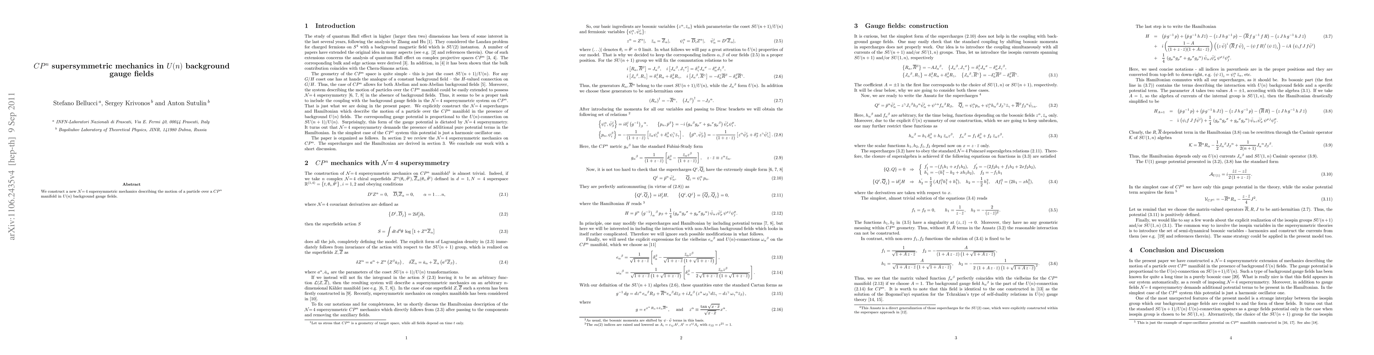 We construct a new N=4 supersymmetric mechanics describing the motion of a particle over a $CP^n$ manifold in U(n) background gauge fields.