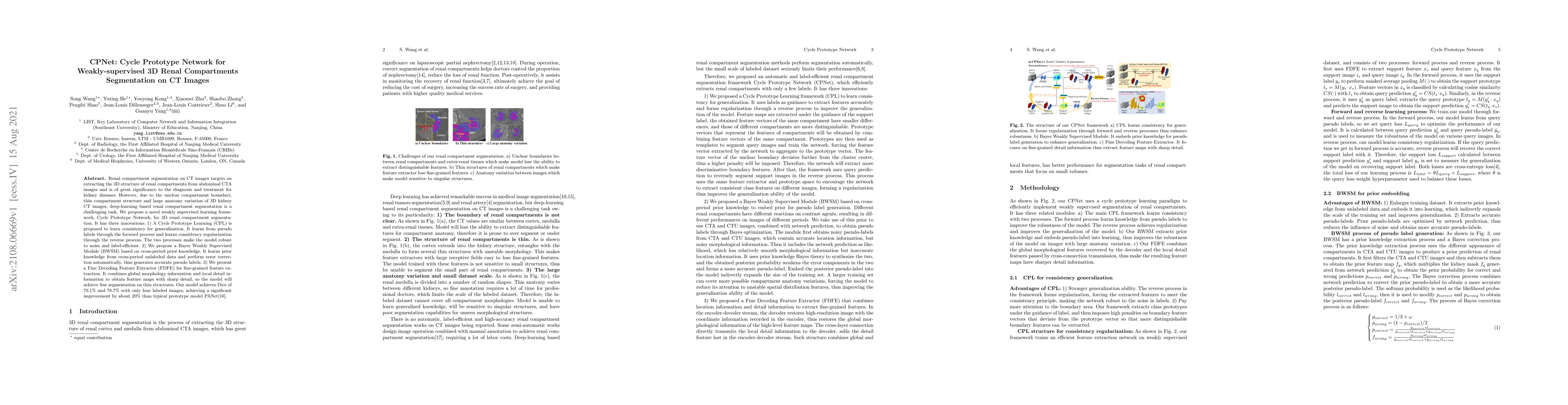 The Cycle Prototype Network (CPNet) introduces a novel weakly supervised learning framework for segmenting 3D renal compartments from CT images, leveraging Cycle Prototype Learning, Bayes Weakly Supervised Module, and Fine Decoding Feature Extractor to achieve robust and accurate segmentation with minimal labeled data. CPNet significantly outperforms typical prototype models, achieving a Dice score of 79.1% and 78.7% with just four labeled images.