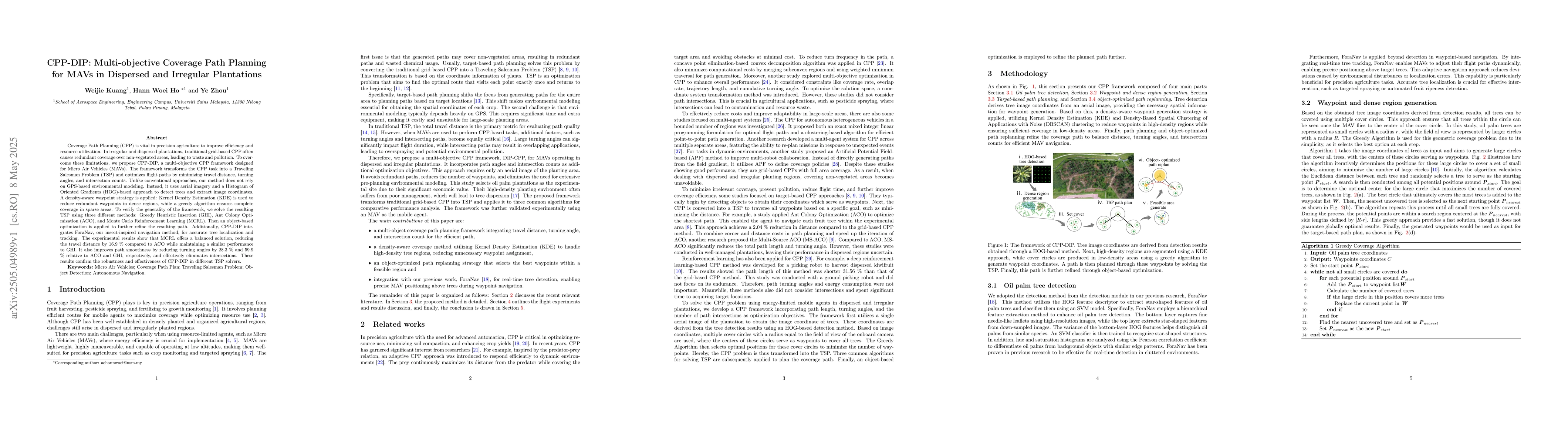 Coverage Path Planning (CPP) is vital in precision agriculture to improve efficiency and resource utilization. In irregular and dispersed plantations, traditional grid-based CPP often causes redundant coverage over non-vegetated areas, leading to waste and pollution. To overcome these limitations, we propose CPP-DIP, a multi-objective CPP framework designed for Micro Air Vehicles (MAVs). The framework transforms the CPP task into a Traveling Salesman Problem (TSP) and optimizes flight paths by minimizing travel distance, turning angles, and intersection counts. Unlike conventional approaches, our method does not rely on GPS-based environmental modeling. Instead, it uses aerial imagery and a Histogram of Oriented Gradients (HOG)-based approach to detect trees and extract image coordinates. A density-aware waypoint strategy is applied: Kernel Density Estimation (KDE) is used to reduce redundant waypoints in dense regions, while a greedy algorithm ensures complete coverage in sparse areas. To verify the generality of the framework, we solve the resulting TSP using three different methods: Greedy Heuristic Insertion (GHI), Ant Colony Optimization (ACO), and Monte Carlo Reinforcement Learning (MCRL). Then an object-based optimization is applied to further refine the resulting path. Additionally, CPP-DIP integrates ForaNav, our insect-inspired navigation method, for accurate tree localization and tracking. The experimental results show that MCRL offers a balanced solution, reducing the travel distance by 16.9 % compared to ACO while maintaining a similar performance to GHI. It also improves path smoothness by reducing turning angles by 28.3 % and 59.9 % relative to ACO and GHI, respectively, and effectively eliminates intersections. These results confirm the robustness and effectiveness of CPP-DIP in different TSP solvers.