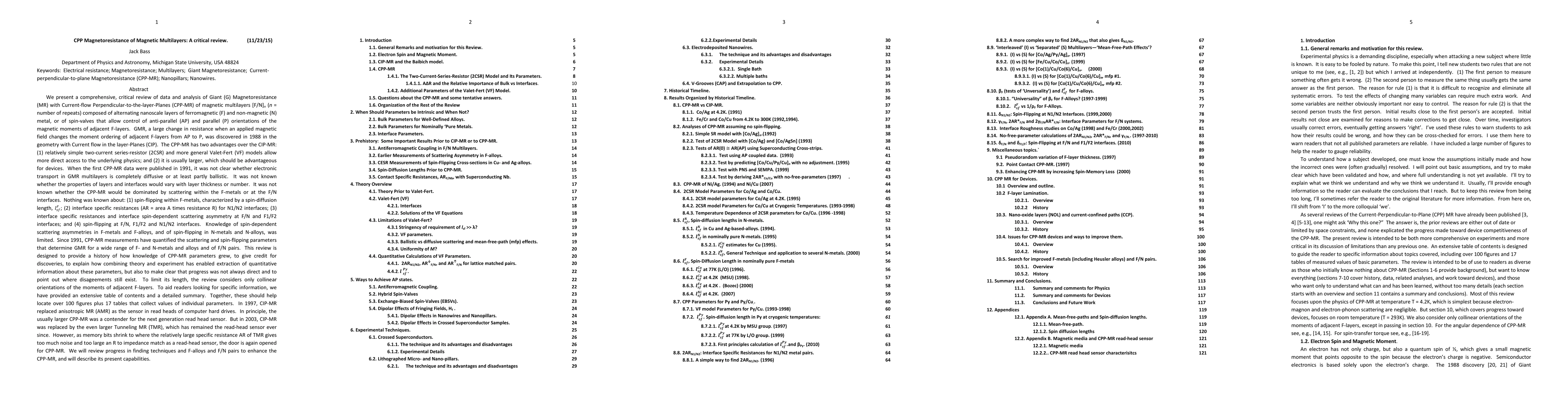 This paper provides a detailed review of Giant Magnetoresistance (GMR) in magnetic multilayers with current flowing perpendicular to the plane (CPP-MR), highlighting its advantages over in-plane current flow. It discusses the evolution of understanding in CPP-MR, including the quantification of spin-dependent scattering and spin-flipping parameters, and reviews advancements in enhancing CPP-MR for device applications.