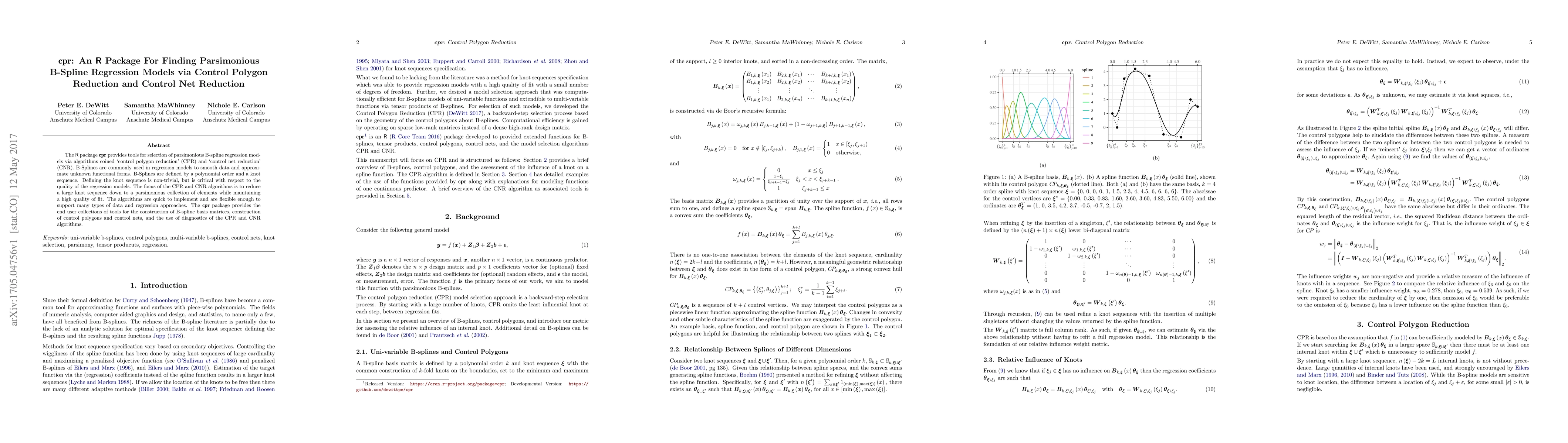 The R package cpr offers tools for selecting parsimonious B-spline regression models using control polygon reduction and control net reduction algorithms. These methods efficiently reduce large knot sequences to a minimal set while preserving model fit quality.