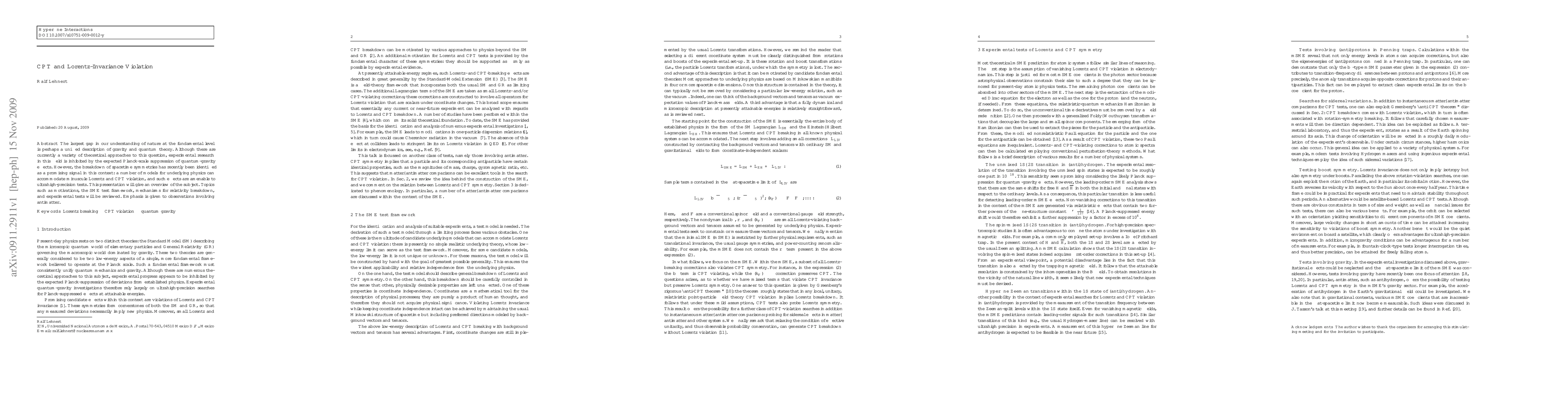 This paper explores CPT and Lorentz invariance violation, a promising approach to unified gravity and quantum theory, focusing on experimental tests and observations involving antimatter. The authors review the SME test framework, mechanisms for relativity breakdown, and implications for our understanding of fundamental physics.