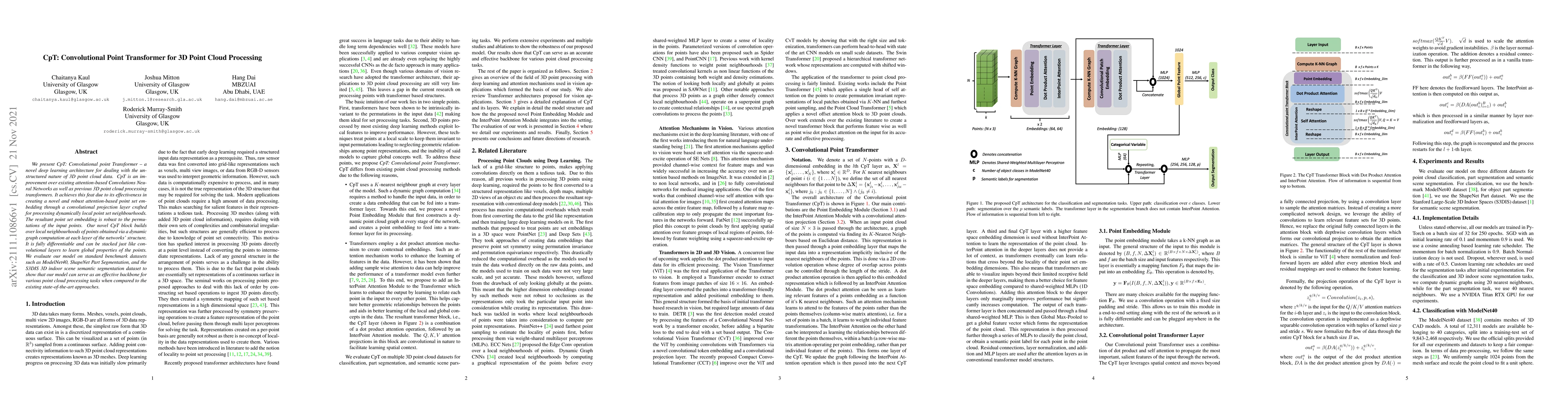 CpT: Convolutional Point Transformer is a novel deep learning architecture designed for processing 3D point cloud data, improving upon existing CNNs and transformers through a robust attention-based point set embedding. It demonstrates superior performance on benchmark datasets for tasks like part segmentation and semantic segmentation.