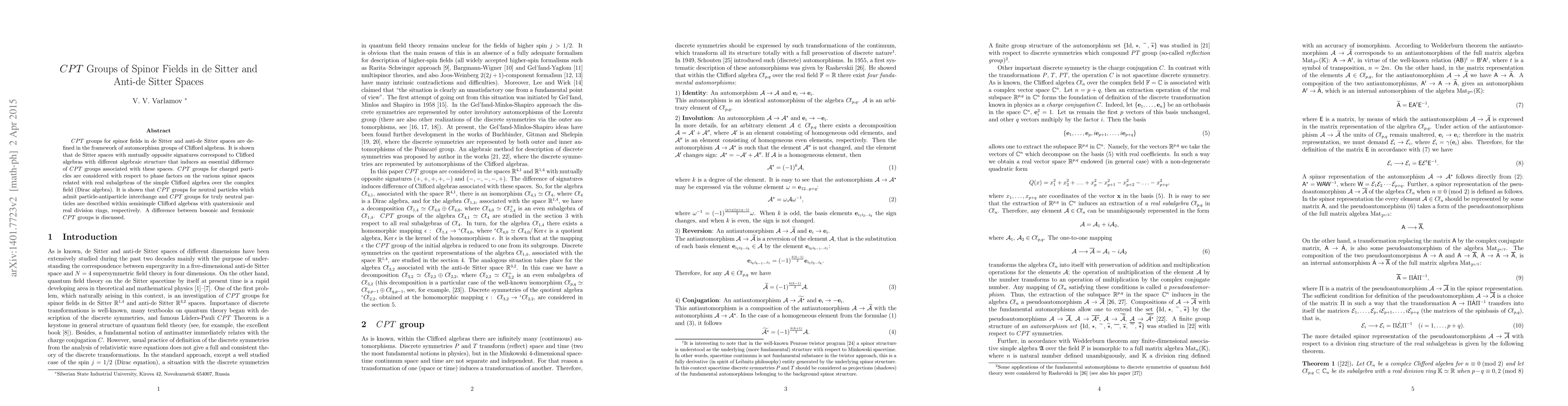This paper defines the $CPT$ groups for spinor fields in de Sitter and anti-de Sitter spaces, revealing that spaces with opposite signatures correspond to Clifford algebras with distinct algebraic structures. It distinguishes $CPT$ groups for charged and neutral particles, showing that neutral particles are described by semisimple Clifford algebras with quaternionic and real division rings, respectively.