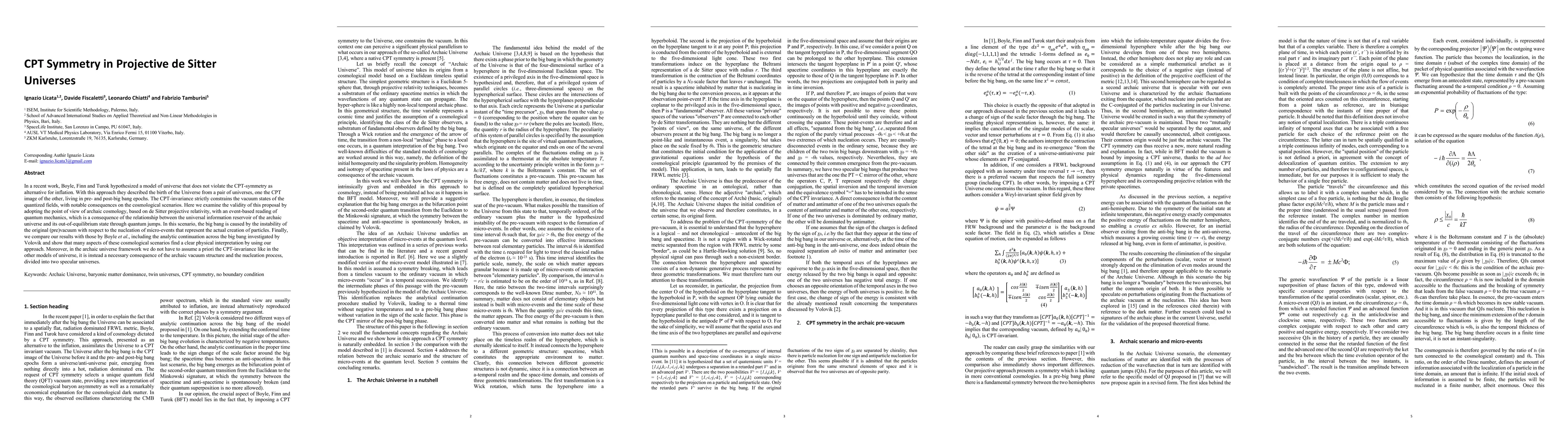 In a recent work, Boyle, Finn and Turok hypothesized a model of universe that does not violate the CPT-symmetry as alternative for inflation. With this approach they described the birth of the Universe from a pair of universes, one the CPT image of the other, living in pre- and post-big bang epochs. The CPT-invariance strictly constrains the vacuum states of the quantized fields, with notable consequences on the cosmological scenarios. Here we examine the validity of this proposal by adopting the point of view of archaic cosmology, based on de Sitter projective relativity, with an event-based reading of quantum mechanics, which is a consequence of the relationship between the universal information reservoir of the archaic universe and its out-of-equilibrium state through quantum jumps. In this scenario, the big bang is caused by the instability of the original (pre)vacuum with respect to the nucleation of micro-events that represent the actual creation of particles. Finally, we compare our results with those by Turok et al., including the analytic continuation across the big bang investigated by Volovik and show that many aspects of these cosmological scenarios find a clear physical interpretation by using our approach. Moreover, in the archaic universe framework we do not have to assume a priori the CPT-invariance like in the other models of universe, it is instead a necessary consequence of the archaic vacuum structure and the nucleation process, divided into two specular universes.