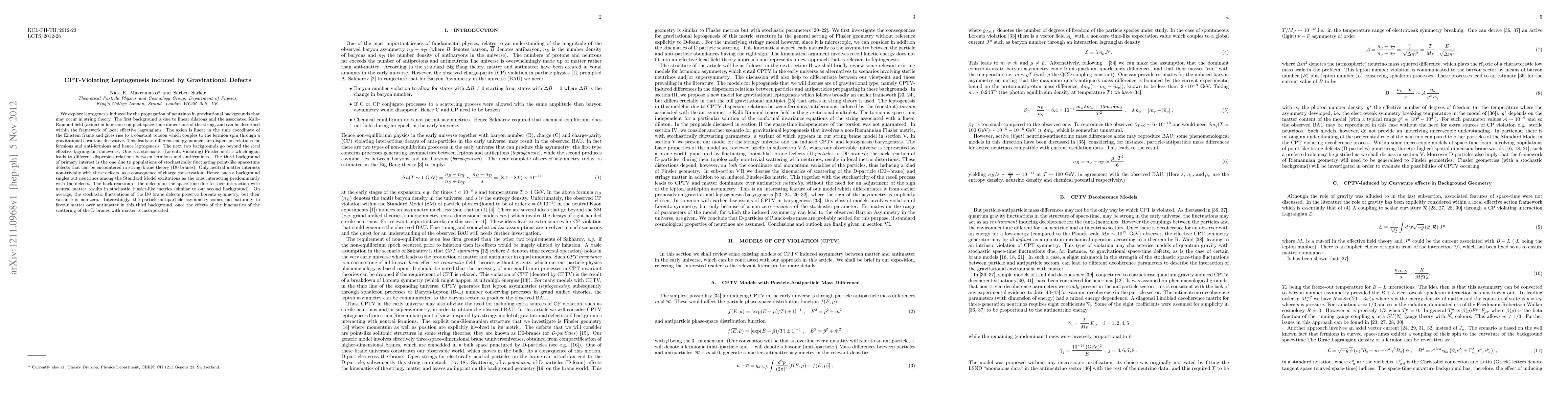 We explore leptogenesis induced by the propagation of neutrinos in gravitational backgrounds that may occur in string theory. The first background is due to linear dilatons and the associated Kalb-Ramond field (axion) in four non-compact space-time dimensions of the string, and can be described within the framework of local effective lagrangians. The axion is linear in the time coordinate of the Einstein frame and gives rise to a constant torsion which couples to the fermion spin through a gravitational covariant derivative. This leads to different energy-momentum dispersion relations for fermions and anti-fermions and hence leptogenesis. The next two backgrounds go beyond the local effective lagrangian framework. One is a stochastic (Lorentz Violating) Finsler metric which again leads to different dispersion relations between fermions and antifermions. The third background of primary interest is the one due to populations of stochastically fluctuating point-like space-time defects that can be encountered in string/brane theory (D0 branes). Only neutral matter interacts non-trivially with these defects, as a consequence of charge conservation. Hence, such a background singles out neutrinos among the Standard Model excitations as the ones interacting predominantly with the defects. The back-reaction of the defects on the space-time due to their interaction with neutral matter results in stochastic Finsler-like metrics (similar to our second background). On average, the stochastic fluctuations of the D0 brane defects preserve Lorentz symmetry, but their variance is non-zero. Interestingly, the particle/antiparticle asymmetry comes out naturally to favour matter over antimatter in this third background, once the effects of the kinematics of the scattering of the D branes with matter is incorporated.