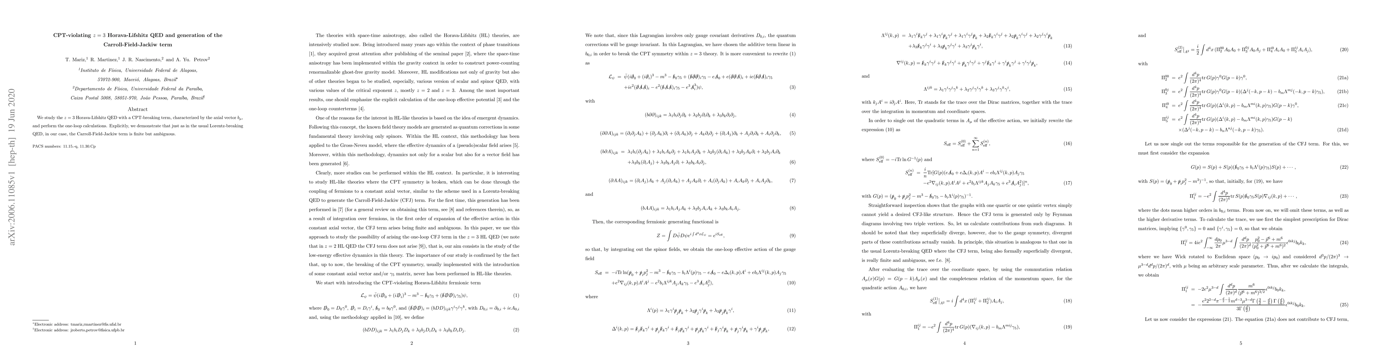 This paper explores $z=3$ Horava-Lifshitz QED with a CPT-violating term involving an axial vector $b_{\mu}$, and finds that, similar to Lorentz-breaking QED, it generates a finite but ambiguous Carroll-Field-Jackiw term through one-loop calculations.