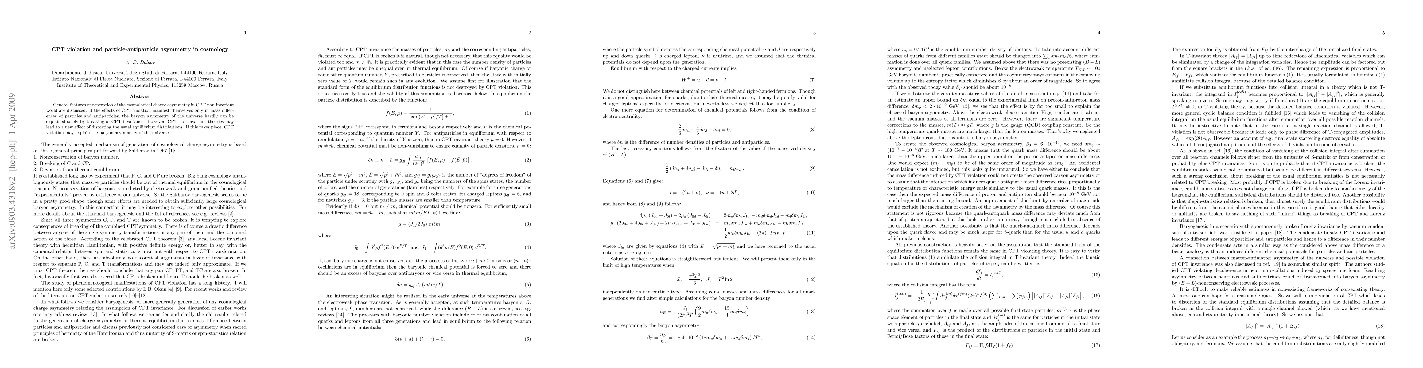 General features of generation of the cosmological charge asymmetry in CPT non-invariant world are discussed. If the effects of CPT violation manifest themselves only in mass differences of particles and antiparticles, the baryon asymmetry of the universe hardly can be explained solely by breaking of CPT invariance. However, CPT non-invariant theories may lead to a new effect of distorting the usual equilibrium distributions. If this takes place, CPT violation may explain the baryon asymmetry of the universe.