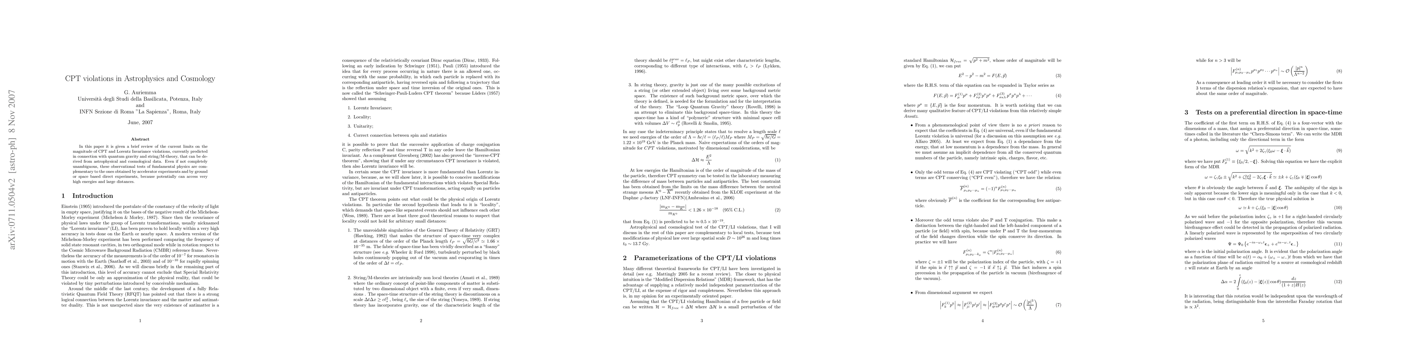 In this paper it is given a brief review of the current limits on the magnitude of CPT and Lorentz Invariance violations, currently predicted in connection with quantum gravity and string/M-theory, that can be derived from astrophysical and cosmological data. Even if not completely unambiguous, these observational tests of fundamental physics are complementary to the ones obtained by accelerator experiments and by ground or space based direct experiments, because potentially can access very high energies and large distances.