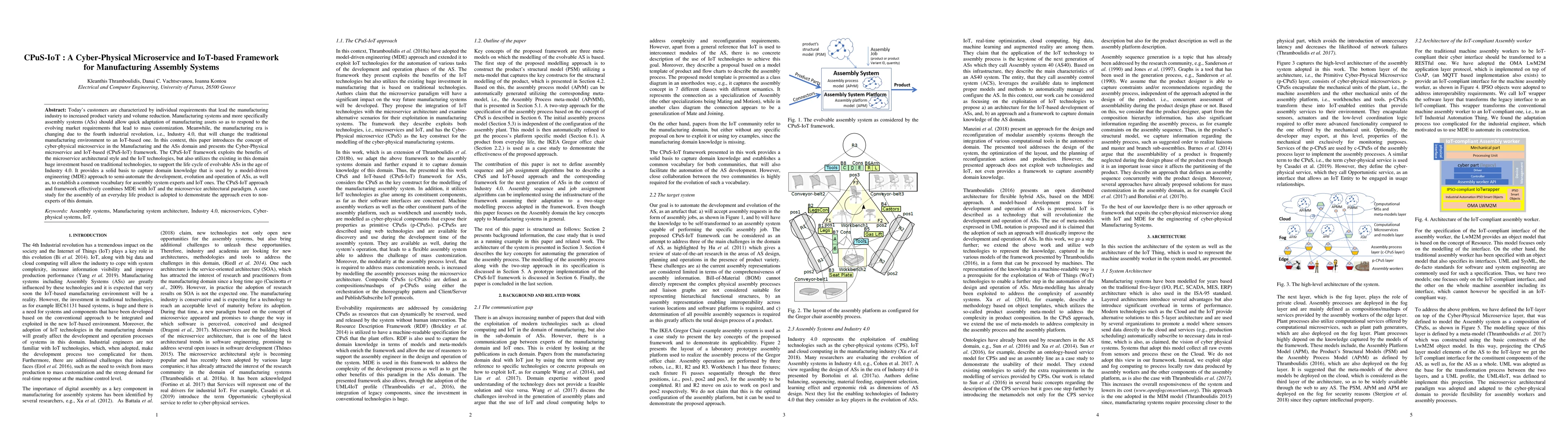 The CPuS-IoT framework integrates cyber-physical microservices and IoT technologies to enable adaptive manufacturing assembly systems in Industry 4.0. It combines model-driven engineering with IoT and microservices to facilitate the evolution and operation of assembly systems, demonstrated through a case study.