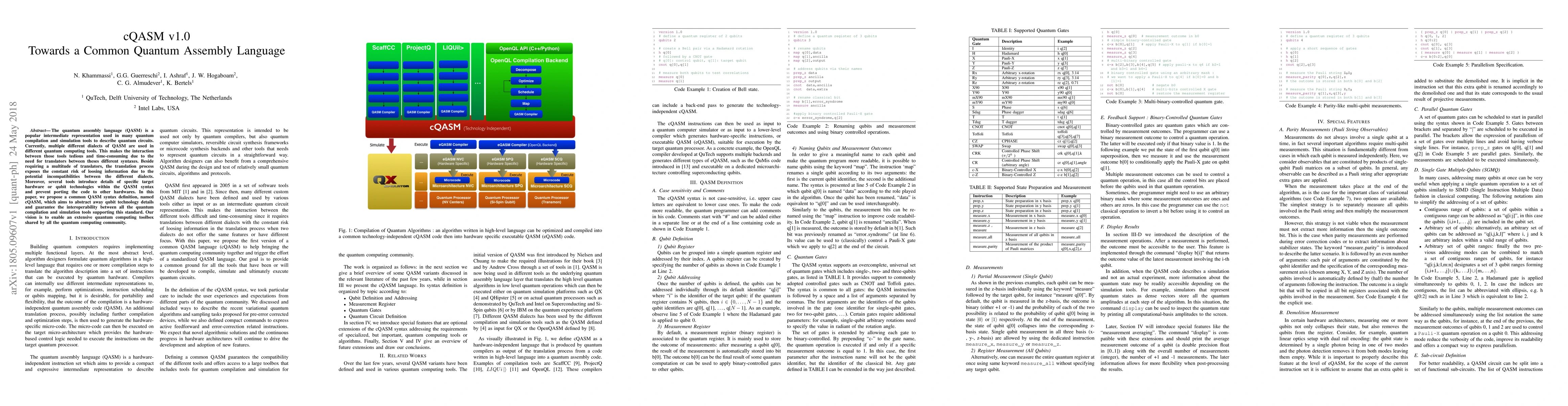 The quantum assembly language (QASM) is a popular intermediate representation used in many quantum compilation and simulation tools to describe quantum circuits. Currently, multiple different dialects of QASM are used in different quantum computing tools. This makes the interaction between those tools tedious and time-consuming due to the need for translators between theses different syntaxes. Beside requiring a multitude of translators, the translation process exposes the constant risk of loosing information due to the potential incompatibilities between the different dialects. Moreover, several tools introduce details of specific target hardware or qubit technologies within the QASM syntax and prevent porting the code to other hardwares. In this paper, we propose a common QASM syntax definition, named cQASM, which aims to abstract away qubit technology details and guarantee the interoperability between all the quantum compilation and simulation tools supporting this standard. Our vision is to enable an extensive quantum computing toolbox shared by all the quantum computing community.