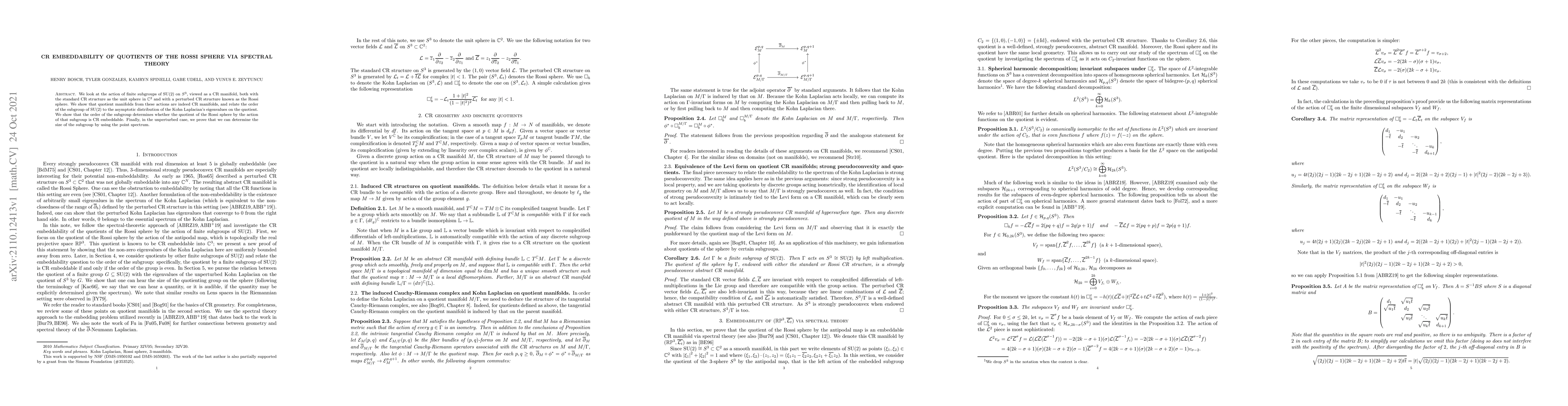 We look at the action of finite subgroups of $\operatorname{SU}(2)$ on $S^3$, viewed as a CR manifold, both with the standard CR structure as the unit sphere in $\mathbb{C}^2$ and with a perturbed CR structure known as the Rossi sphere. We show that quotient manifolds from these actions are indeed CR manifolds, and relate the order of the subgroup of $\operatorname{SU}(2)$ to the asymptotic distribution of the Kohn Laplacian's eigenvalues on the quotient. We show that the order of the subgroup determines whether the quotient of the Rossi sphere by the action of that subgroup is CR embeddable. Finally, in the unperturbed case, we prove that we can determine the size of the subgroup by using the point spectrum.