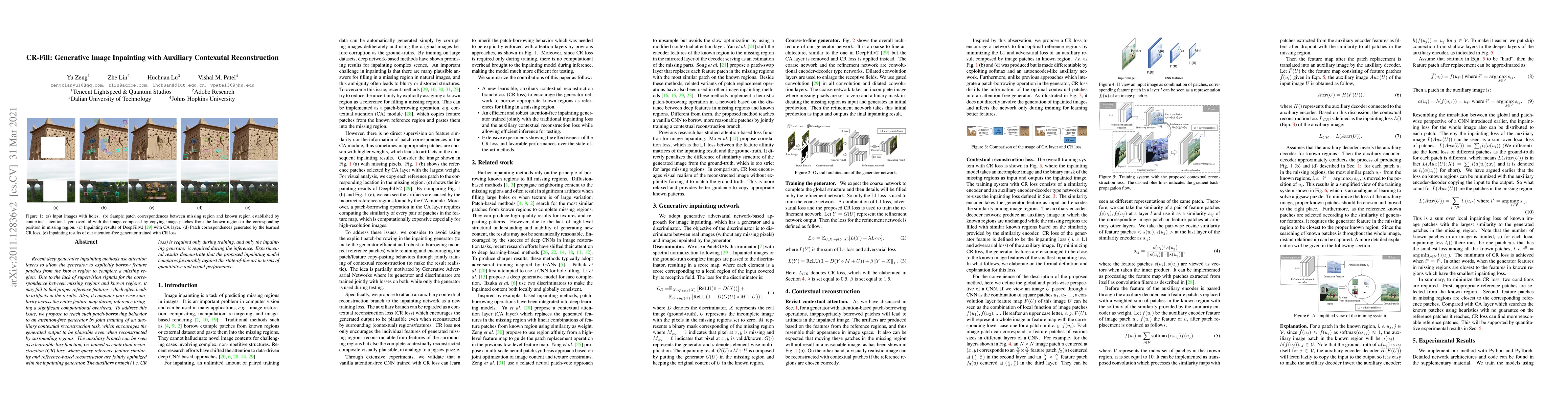 The paper proposes CR-Fill, a generative image inpainting method that uses an auxiliary contextual reconstruction task to guide the inpainting process without requiring attention layers, thus reducing computational overhead and improving artifact reduction. The method achieves state-of-the-art performance in both quantitative and visual metrics.